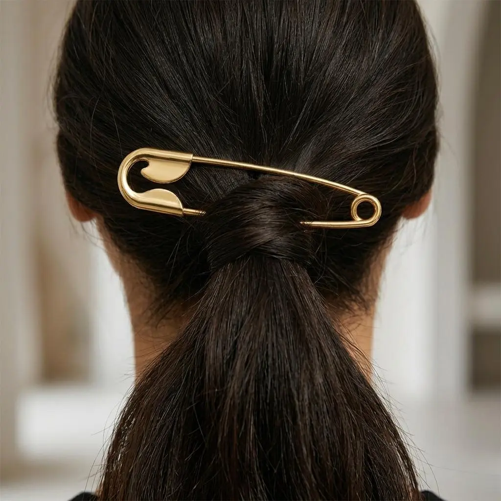 Y2K Edgy Oversized Safety Pin Hair Clip | Jumbo Gold Metal Hair Accessory | Industrial Punk Barrette