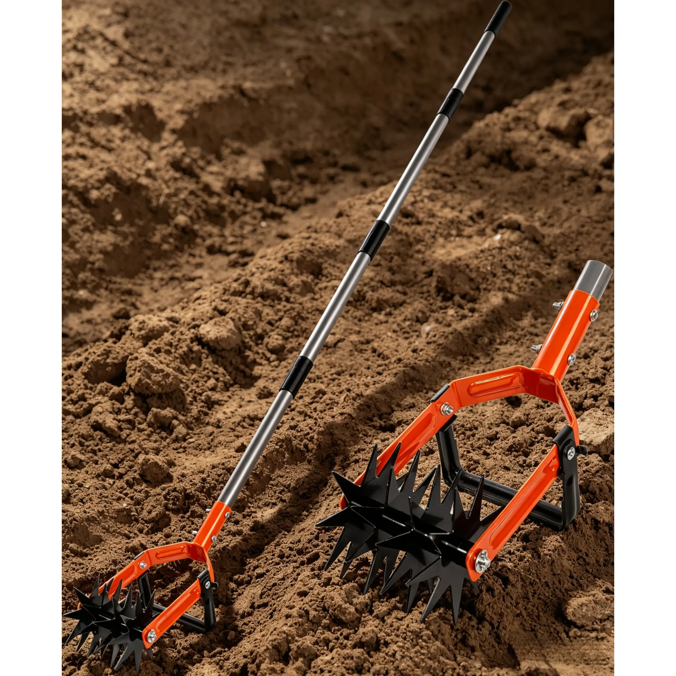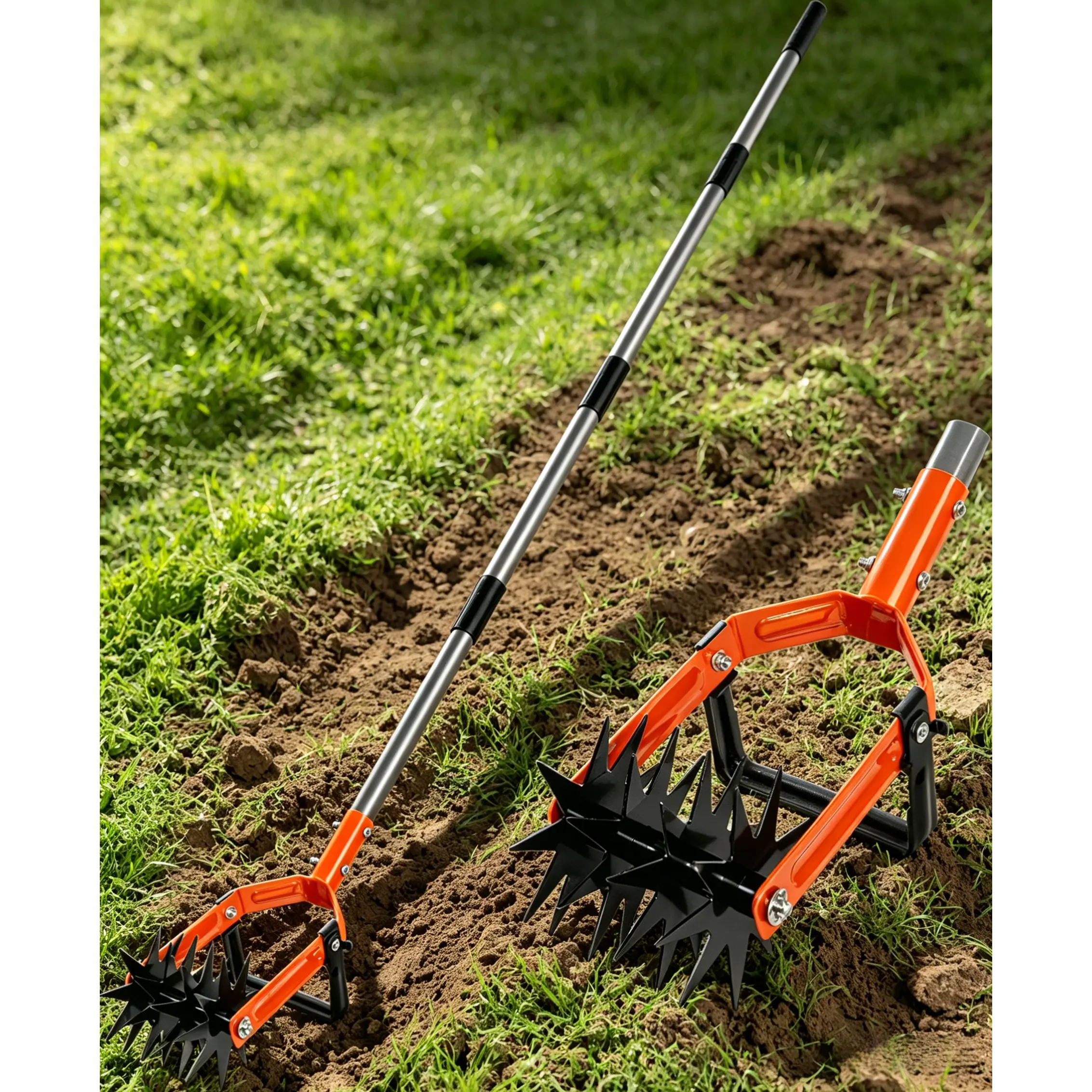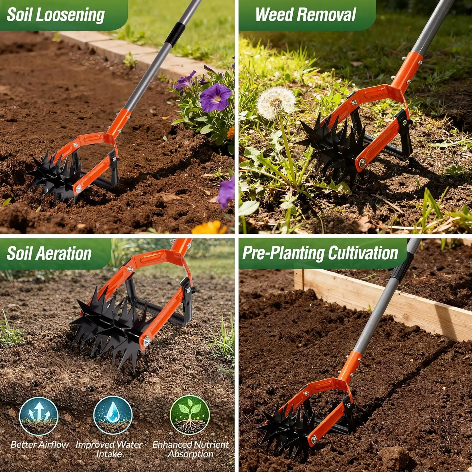 Rotary Cultivator Garden Tool, Adjustable Long Handle Hand Tiller with Star-Shaped Rolling Tines, 2-in-1 Weeder & Soil Aerator for Lawn Care, Reseeding Grass, Soil Mixing, Manual Yard Tiller