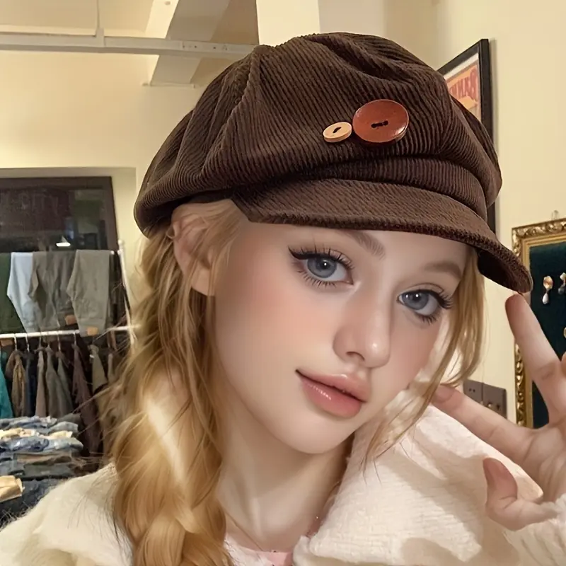Retro Corduroy Beret Hat - Breathable Flannel Octagonal Design with Button Detail, Brown Four-Season Versatile Literary Style Hat for Casual Outfits, Birthday Gift for Friends