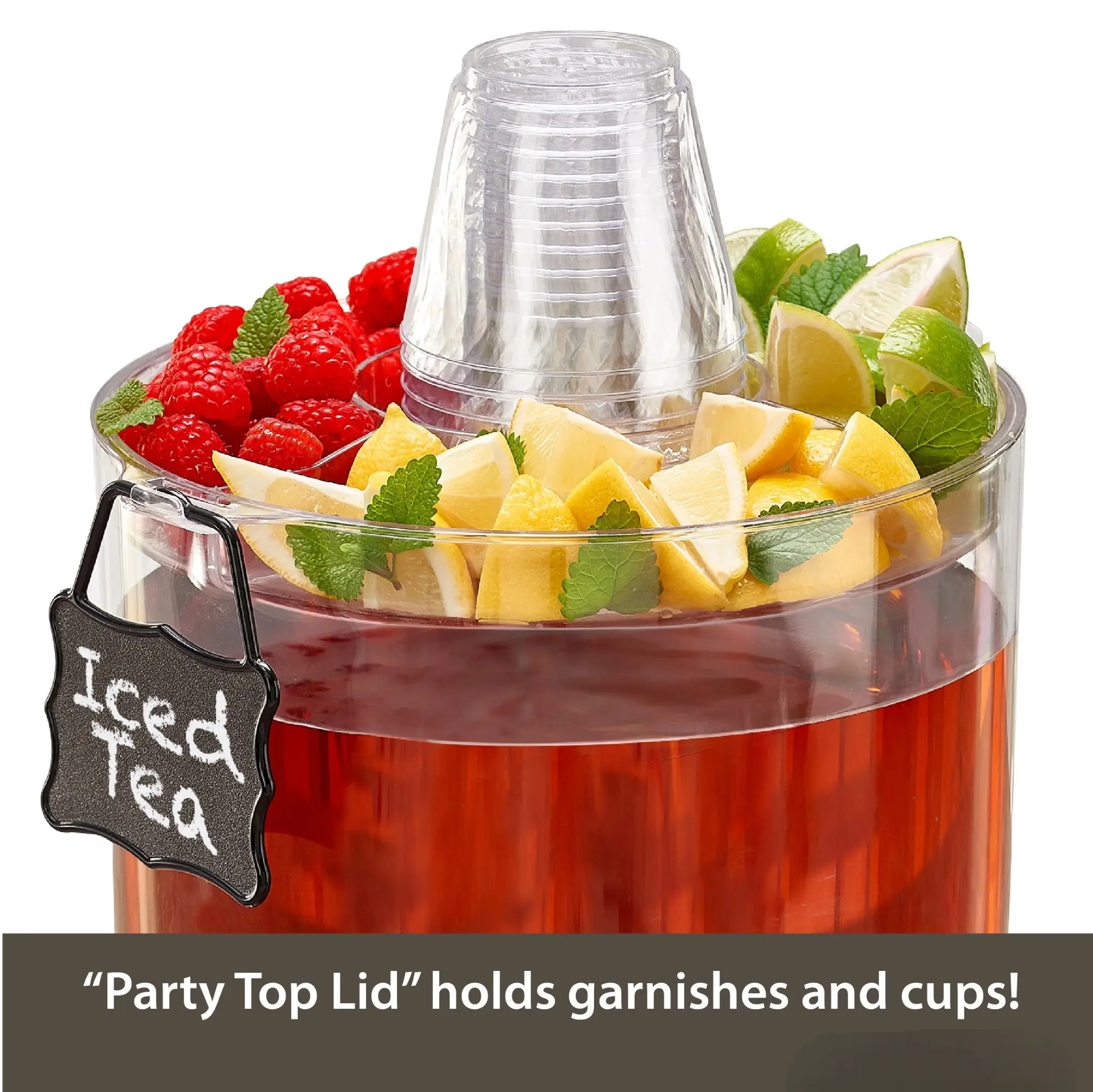 Serve drinks in style with this versatile beverage dispenser, designed to make entertaining easier and more organized. The unique “party top” lid features built-in compartments for cups, garnishes, sweeteners, and more—keeping everything you need within reach.
