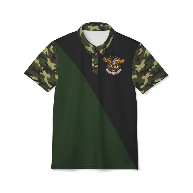 USA 250 Eagle Camo Polo Shirt for Men – Green Black Diagonal Camouflage Golf Polo, Patriotic American Eagle Performance Shirt