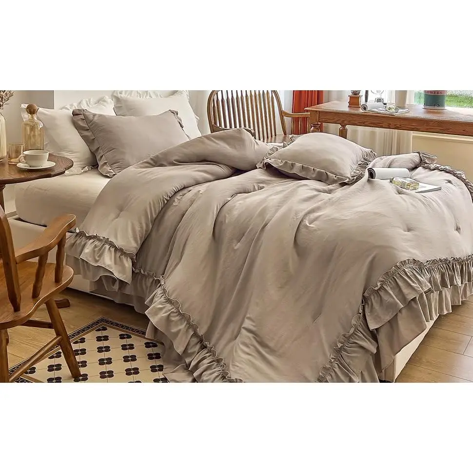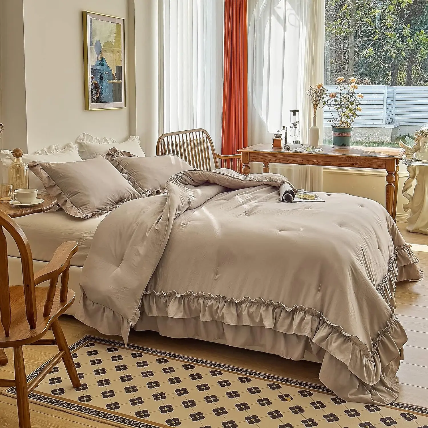 A solid comforter creates a clean look, and the ruffle comforter adopts a retro hem decorative pattern to show an elegant appearance and atmosphere.