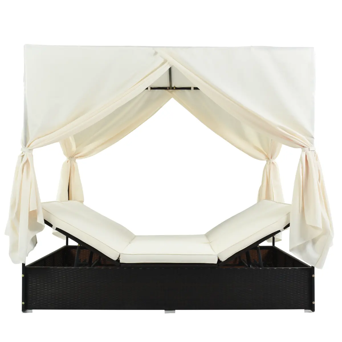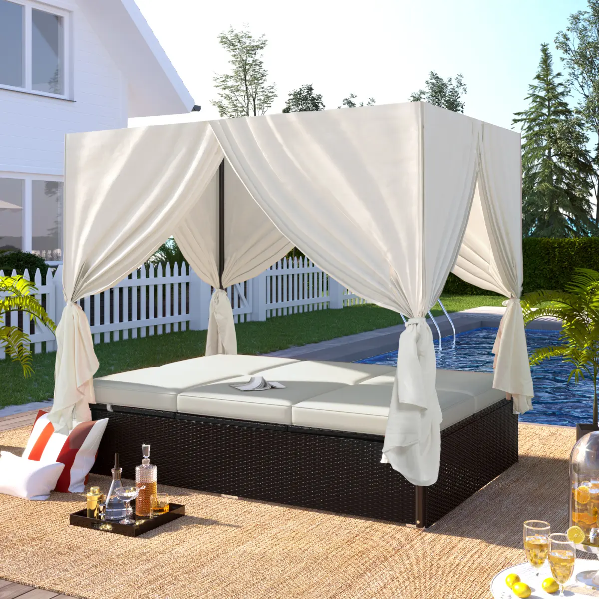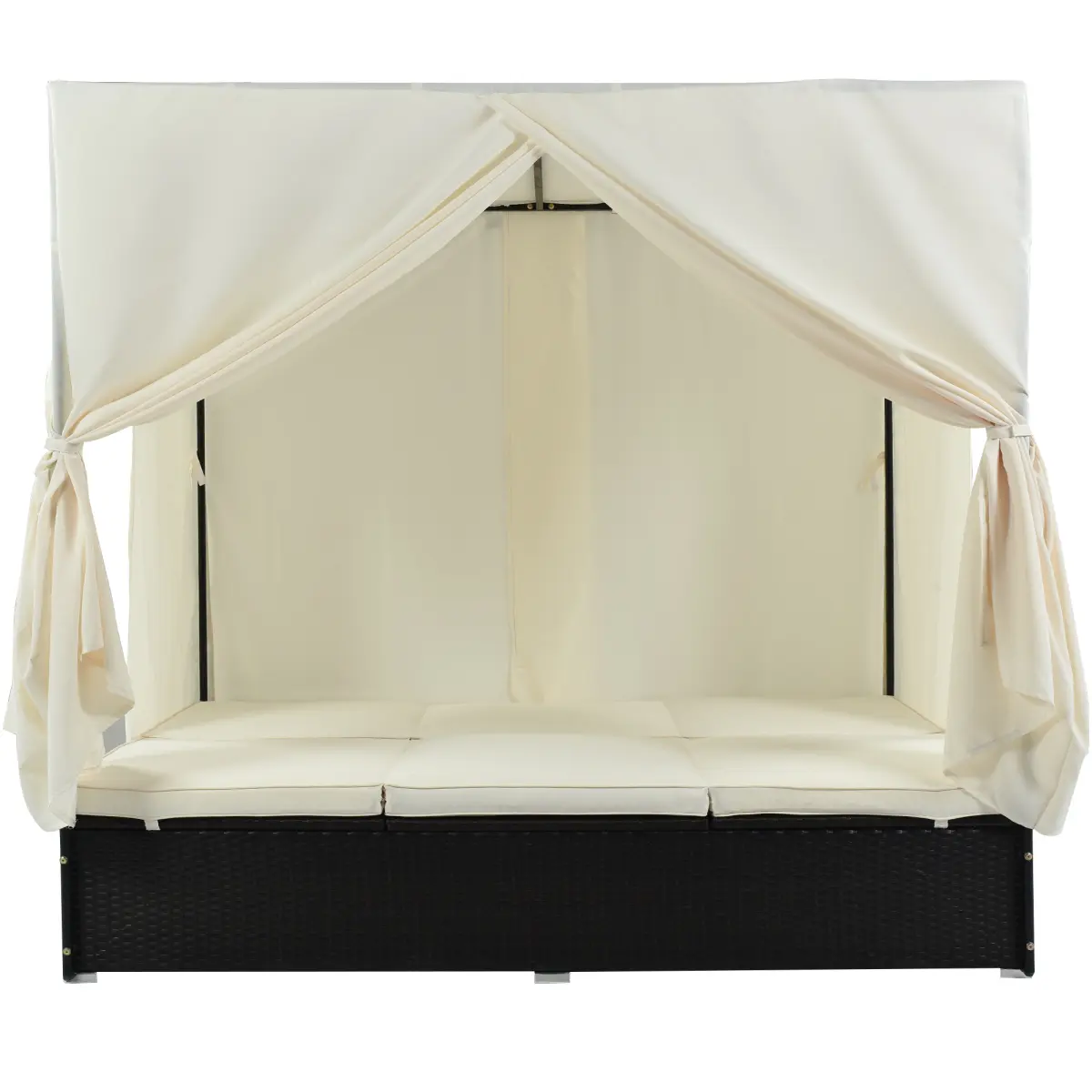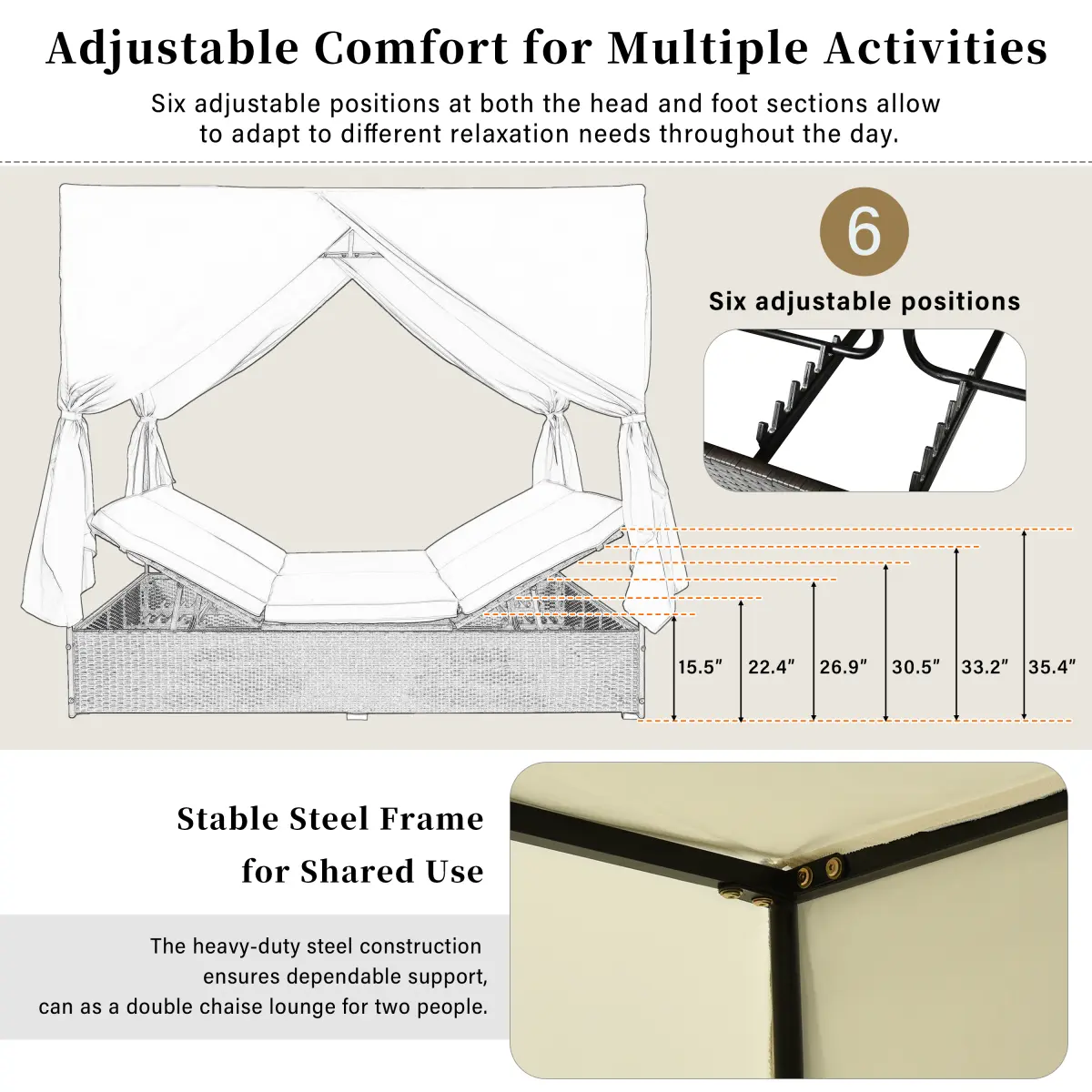 This outdoor daybed is designed to bring together stability, comfort, and practical outdoor functionality.A sturdy steel frame combined with an HDPE-wrapped base provides reliable support and durability for everyday outdoor use.The spacious double lounge design includes two separate cushions, with both the head and foot sections offering six adjustable positions to suit different relaxation needs.Surrounding curtains can be opened or closed as desired, offering light sun shading and a sense of privacy without blocking the view or airflow.Lightly water-resistant cushions and curtains add everyday convenience, making this daybed a comfortable and versatile choice for patios, backyards, terraces, or poolside settings.