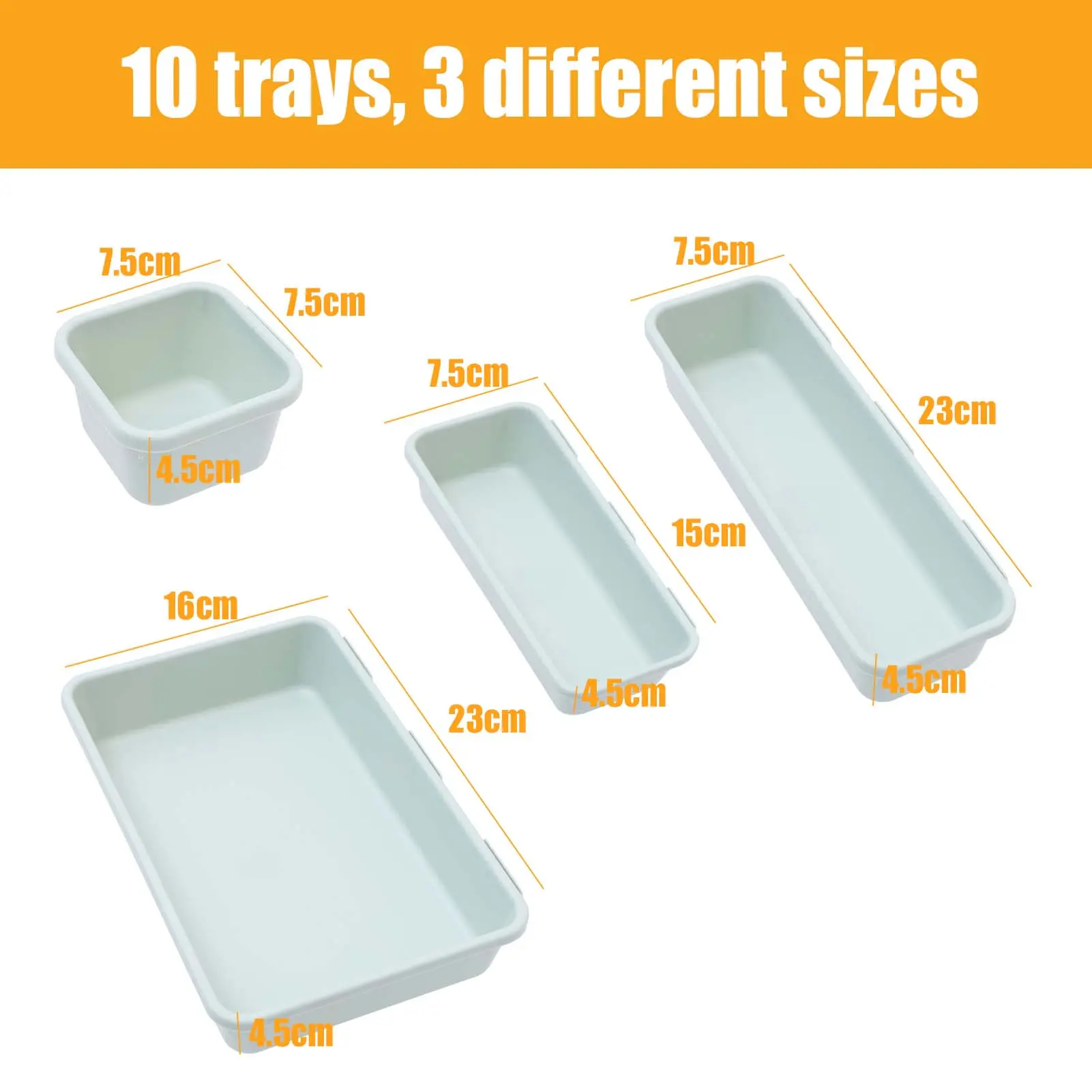 This set includes 4 different sizes of lightweight storage bins, perfect for various spaces. Ideal for kitchen, bathroom, makeup, and office use. Each bin is designed to fit neatly into drawers, maximizing storage efficiency. The plastic material ensures durability and ease of use.