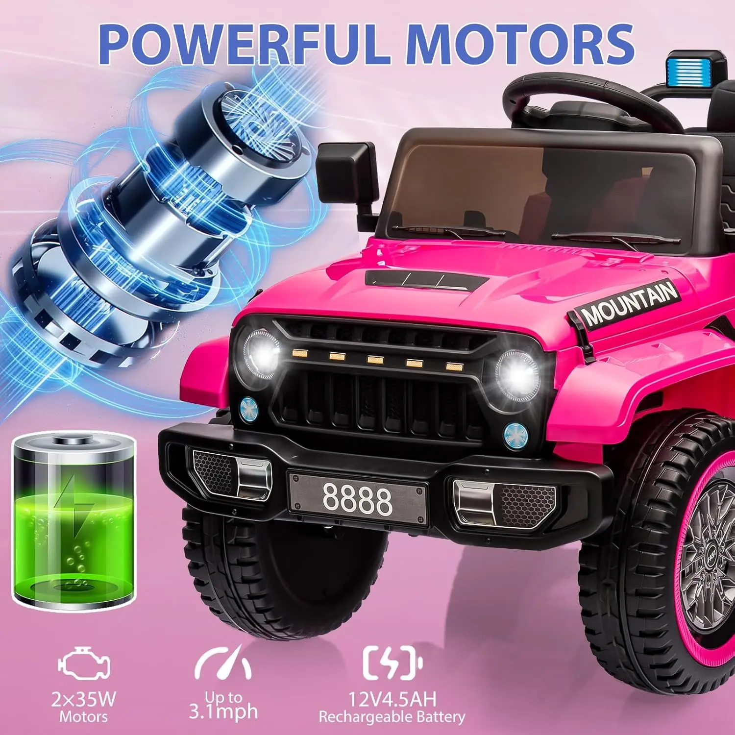 ·【RECHARGEABLE BATTERY】The 12V battery-powered car is equipped with efficient and stable batteries. Two 35W motors provide sufficient power and long service life. The lower right corner of the steering wheel is equipped with a safe charging hole, which can be plugged into and charged directly for safety upgrades. NOTE: Be sure to read the instructions carefully before use.