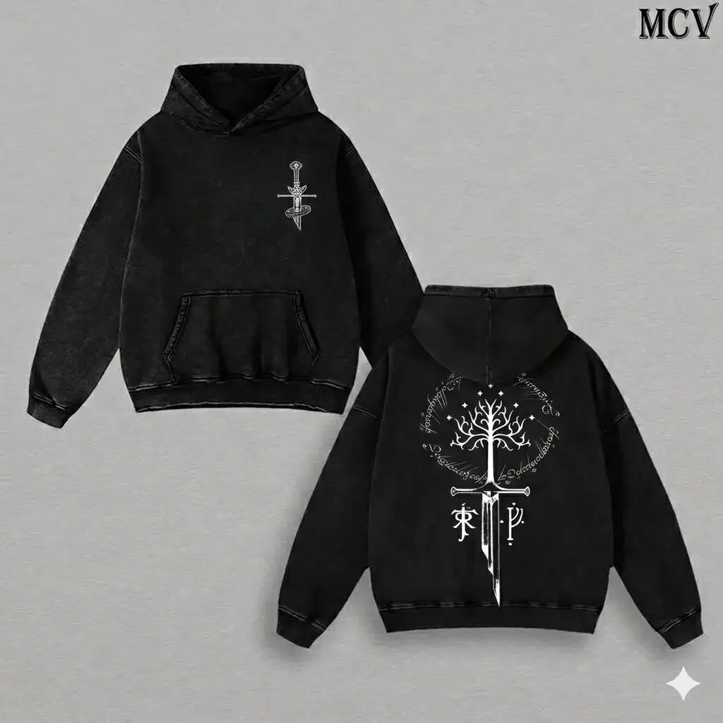 Middle Earth Fantasy Inspired Washed Hoodie, Vintage Distressed Oversized Epic Adventure Streetwear Pullover