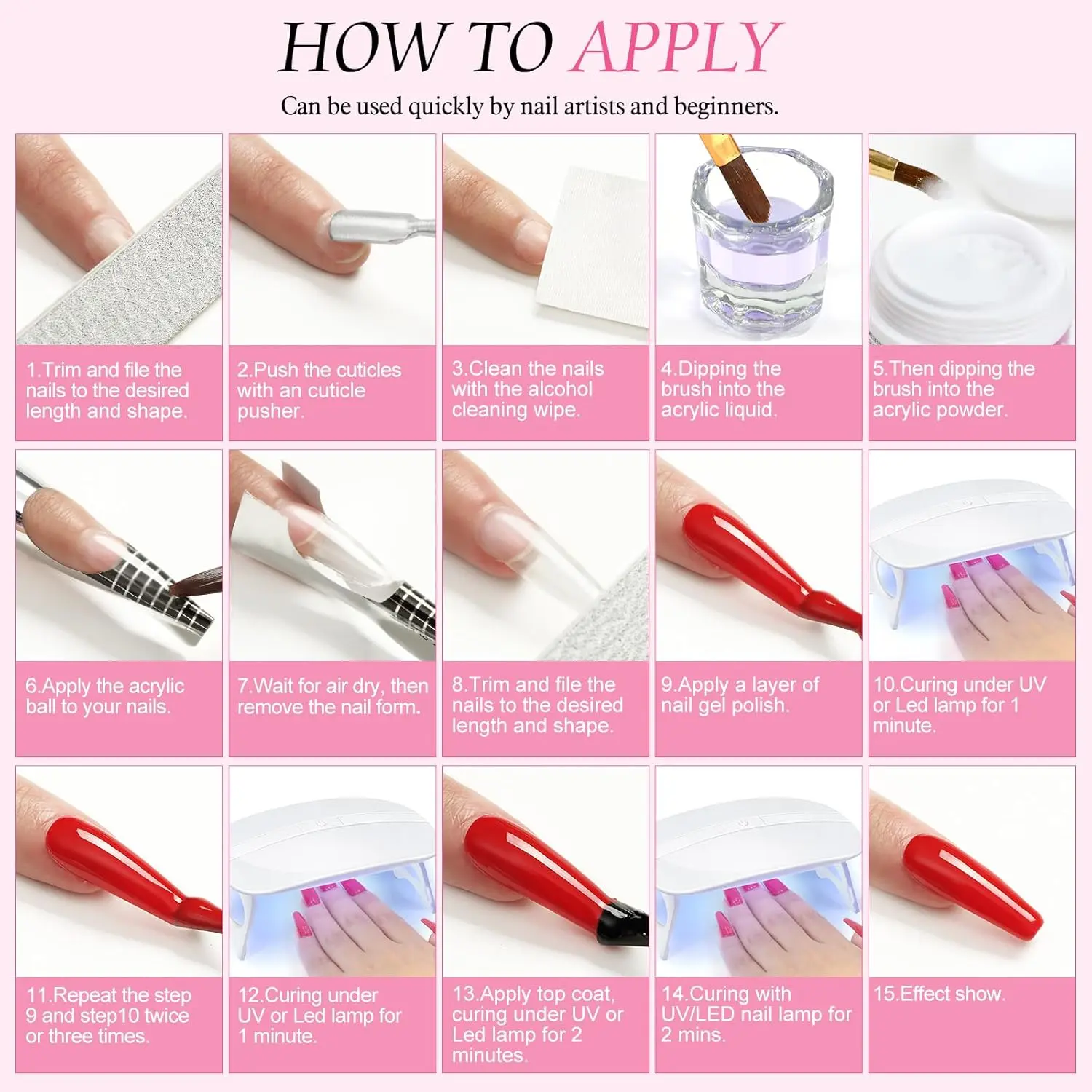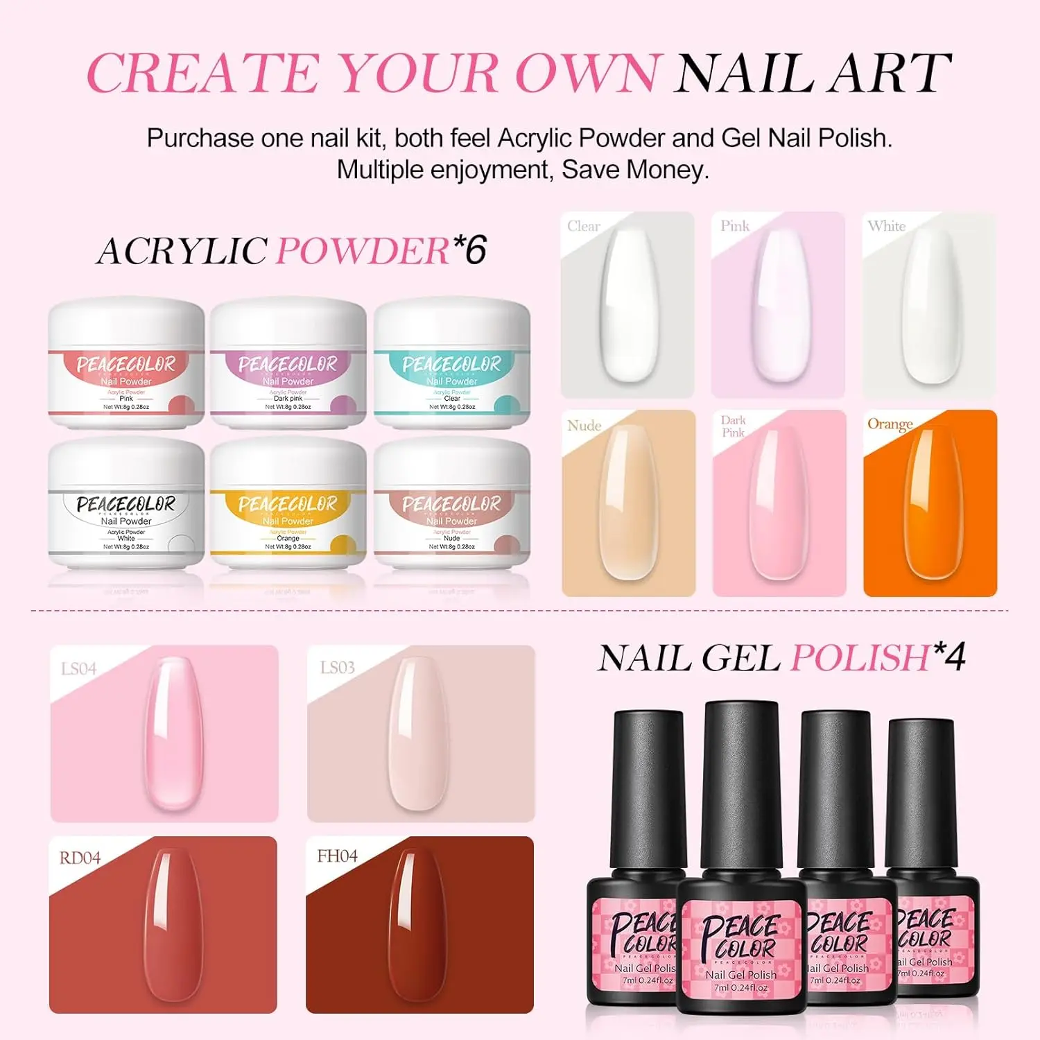 [Acrylic Nail Kit for Beginners with Everything]PEACECOLOR Acrylic nail kit for beginners includes 6 colors acrylic powder, 4 colors gel nail polish, 24pcs glitter powder, nail drill, nail lamp, nail art rhinstones, french nail stickers, base top coat,100pcs false nail tips, and other nail tools. DIY nail art designs you like by yourself at home with this acrylic nail kit. [6PCs Acrylic Powder&24PCs Glitter Powder]In our acrylic nail kit with everything, you can enjoy 6 colors acrylic powder (clear/white/pink/nude/orange/dark pink) ,which can used for nail carving and nail extension and french nails. 24pcs decoration glitter powder have variety colors,which can be mixed with acrylic nail powder used together. You can create different styles of nail art. [4PCs Gel Nail Polish & 100pcs Nail Tips]4pc gel nail polish has vibrant colors and high shades, which are suitable for all seasons and all kinds of occasions and everyday life. Used with powders or rhinestones to get a more nail effect. In addition, there are 100pc full cover false nail tips that can easily extend the nails. Buy one nail kit, you can get multiple nail art products and achieve various nail effects. [Nail Drill & Nail Lamp]Nails Kit Acrylic Set for beginners comes with nail drill which equipped with 6 different drill bits, you can use these bits to remove cuticle, remove nail art, and polish the nail surface. Nail lamps can help you get your nail art done in minutes. Easy to carry, making it convenient for you to go to nail salons anytime and anywhere. [Ideal Gifts for Her]This nail kit for beginners with everything has common classic colors ,suitable for give for your wife, girlfriend, mother, sisters in special days,everyone who receives it will love it. They are appropriate for all daily working or dating, party or ceremony activity,festival, such as Valentines day, Mothers Day, Halloween, Thanksgiving, Christmas, New Year's Day.