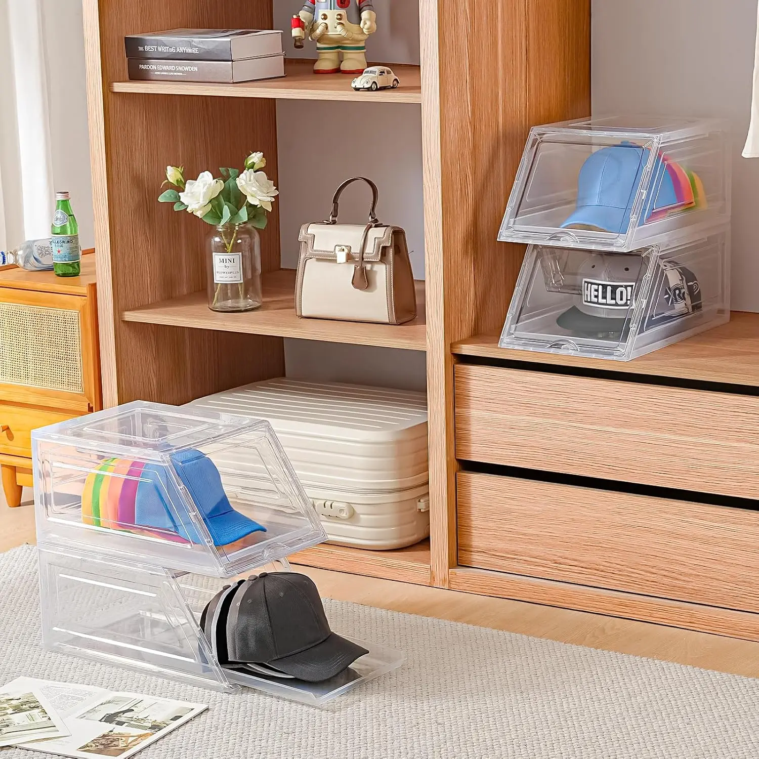 2 Pack Stackable Hat Organizer for Baseball Caps, Large Clear Hat Holder with Sliding Drawer, Hat Storage Box with Door, Baseball Cap Organizer