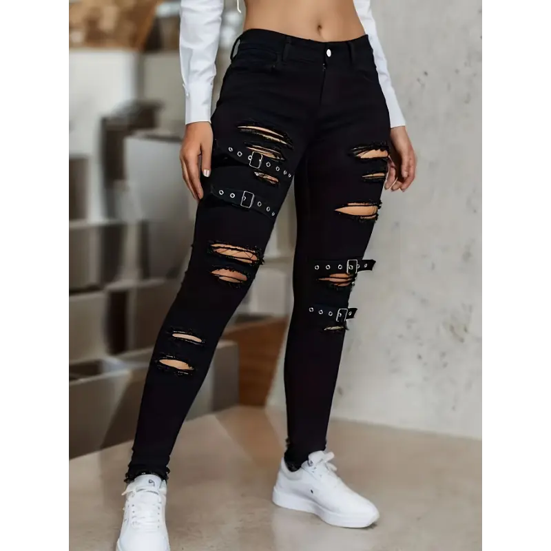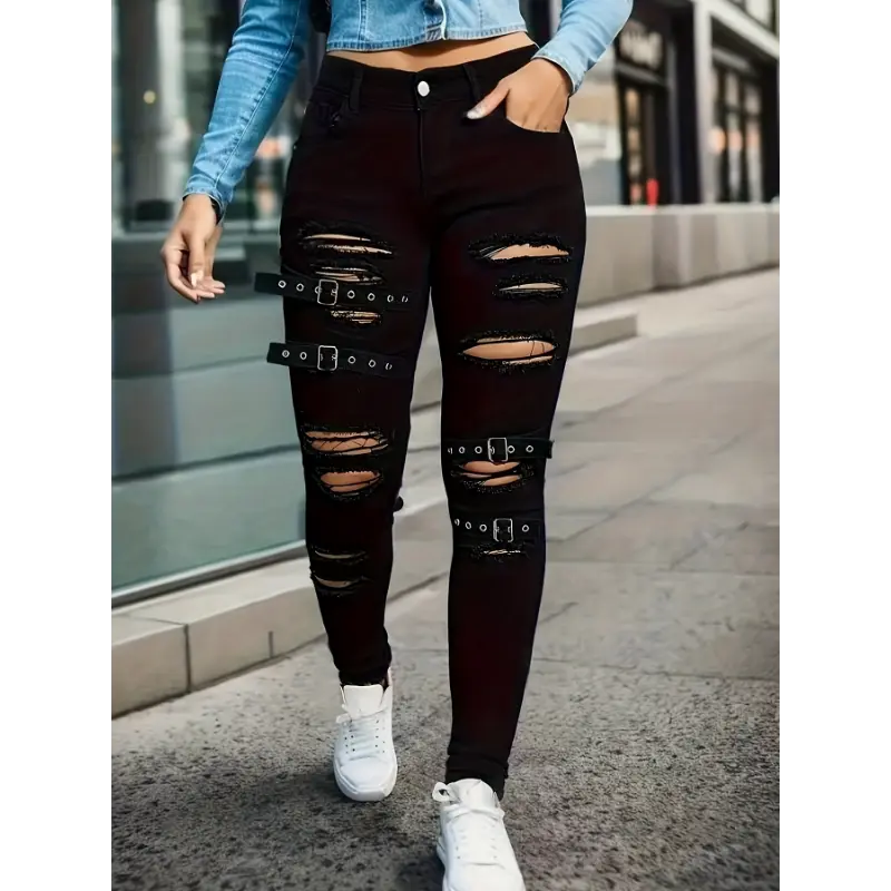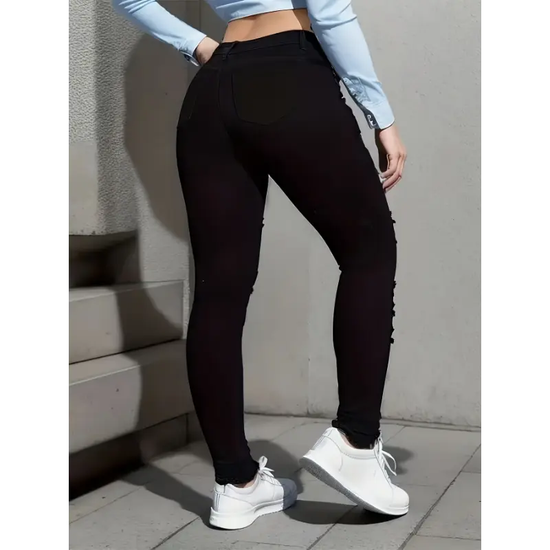 Women's-Waisted Distressed Black Color Ripped Jeans With, Style Skinny Pants/Fall