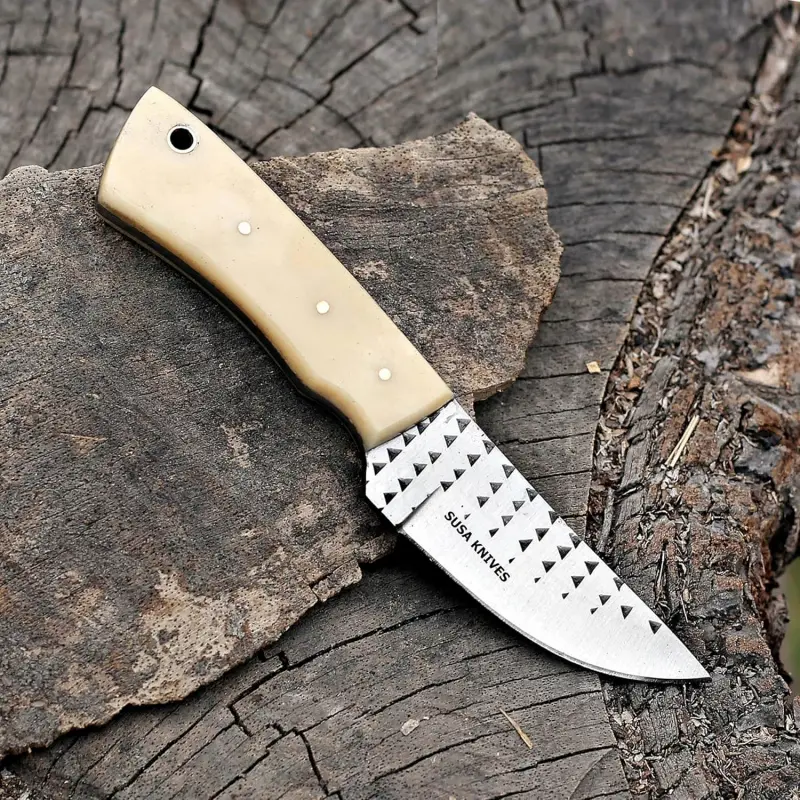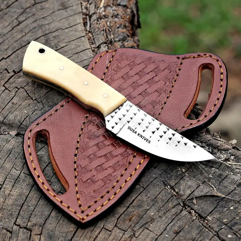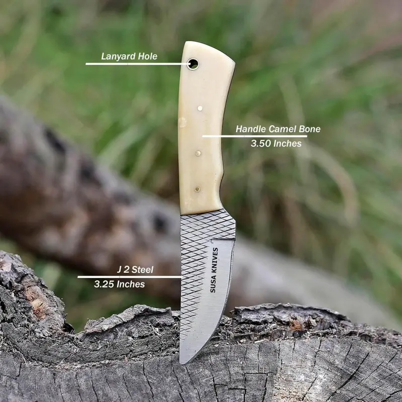 RASP STEEL Bull cutter This is made of pure hand forging and quenching process, which makes the extremely and durable. This handmade is suitable for slicing and dicing, hunting, fishing & camping. FULL TANG BONE HANDLE - Carefully polished Full Tang BONE Handle, feel comfortable, smooth and labor-saving. This hunting is a beauty, performance this strong design with a good strength, durability. SUPERIOR QUALITY HANDMADE - Carefully selected J2 steel. ensure extraordinary strength, durability. Overall Length: 7" Handle Length: 4" Length: 3" Material: Handle Material: CAMEL BONE . Includes a hand stitched custom full-grain PANCAKE leather sheath with a belt loop Tips to Care: Never store your for long time in leather sheath. Leather can absorb water, which can rust the. Always clean the after using with oil or wax.