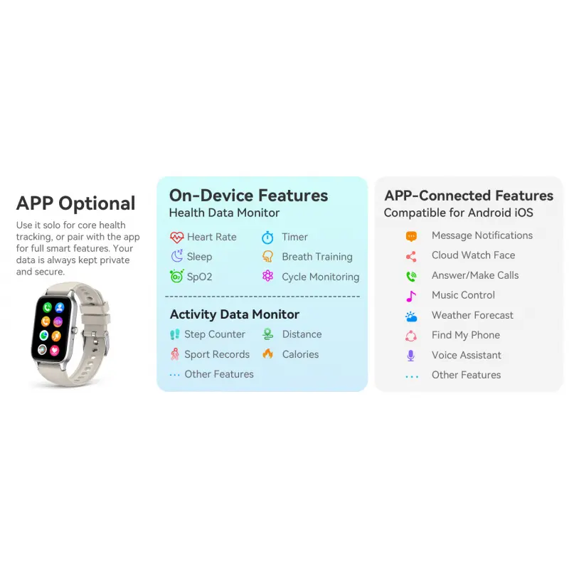 From Steps to Success: See how every move adds up.This powerful fitness tracker watch for women and men is your key to unlocking a more active life.As a precise step counter watch and pedometer, it tracks your calories, distance, and daily activity all day long.Use the app to connect your efforts to your goals.Let this advanced step tracker watch be the motivation you need to transform your fitness journey, one step at a time