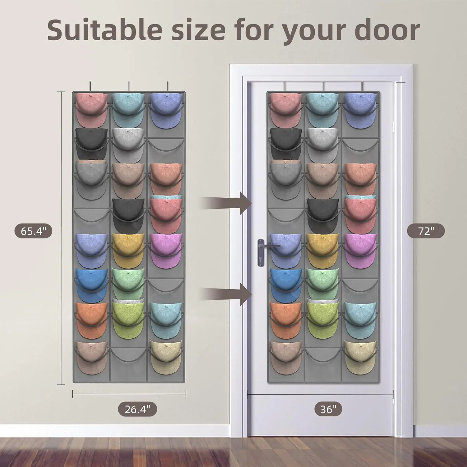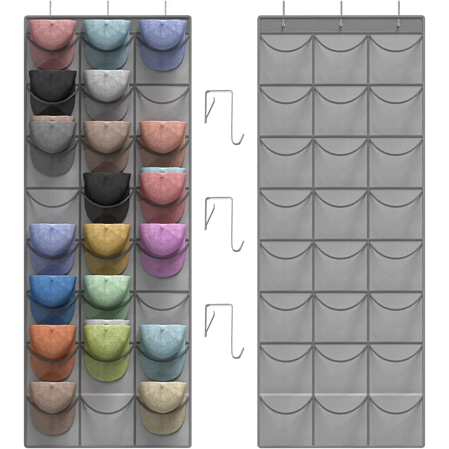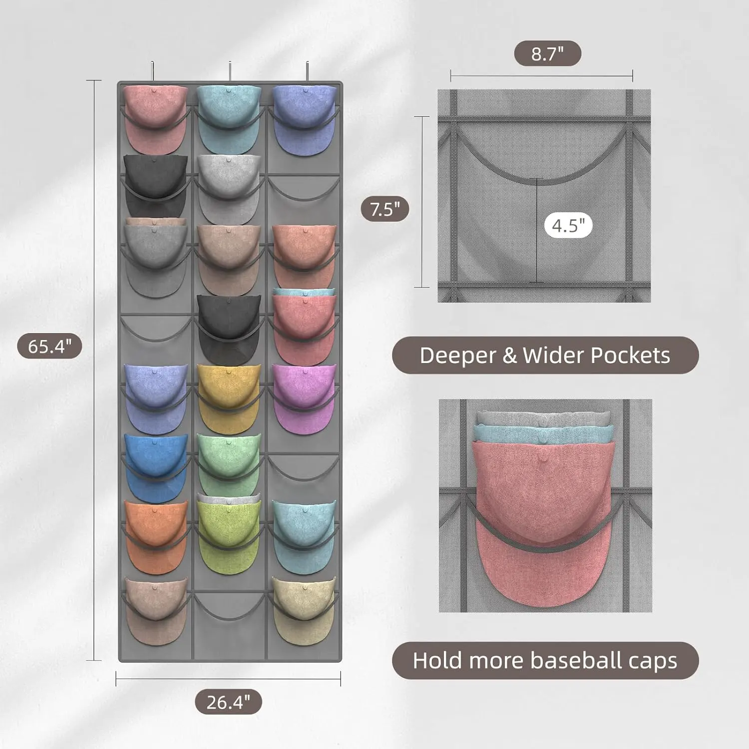 Grey Hat Organizer Racks for Baseball Caps, 24 Deeper Pockets Baseball Hat Rack, Cap Rack, Hat Rack for Door with 3 Hooks