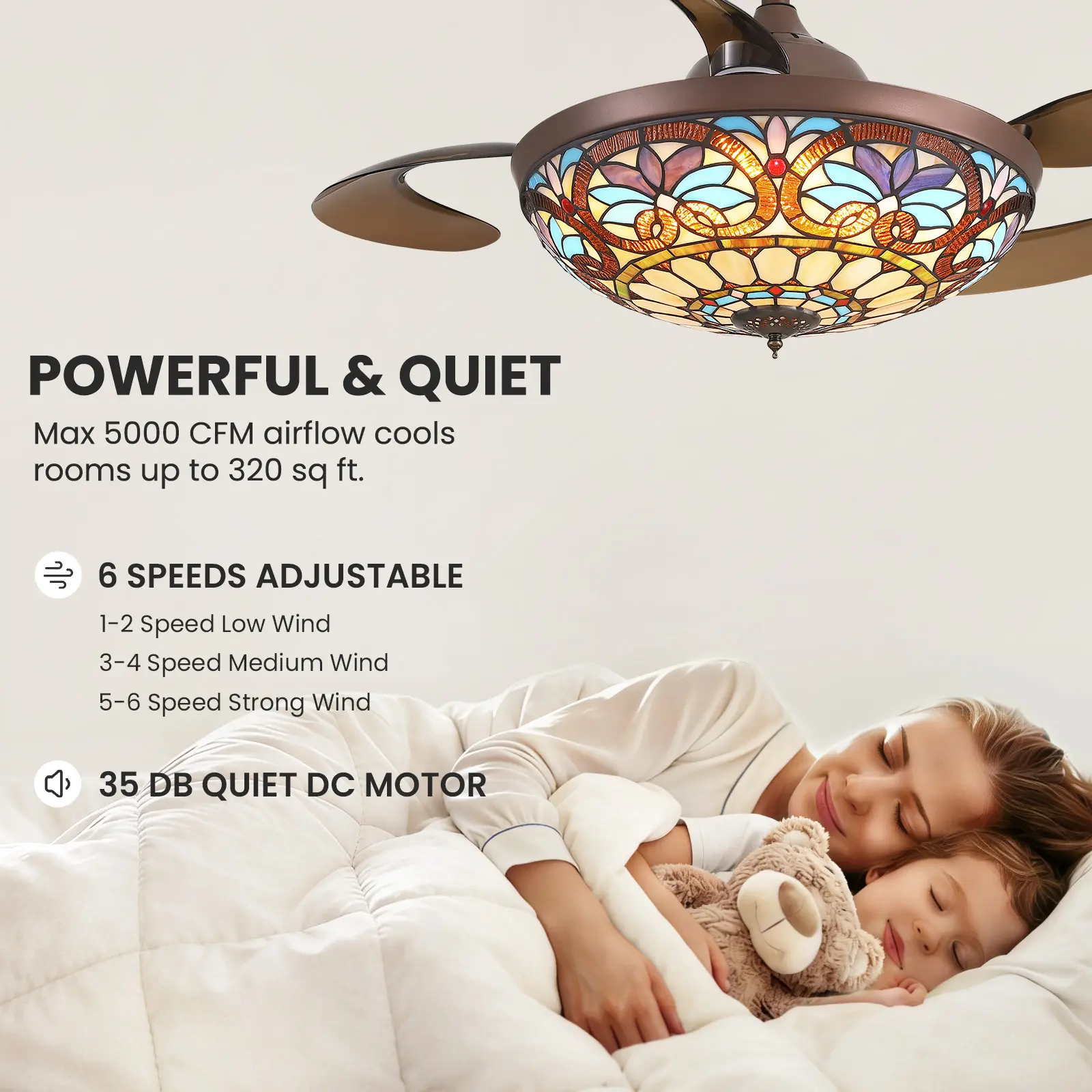 6-speed adjustable airflow with an upgraded natural breeze mode for customized comfort. Effortlessly control all functions via remote control or app with just one tap, including the convenient 2-hour sleep timer ideal for bedtime use.