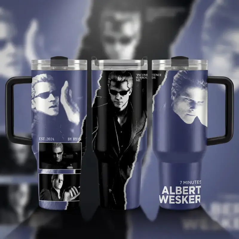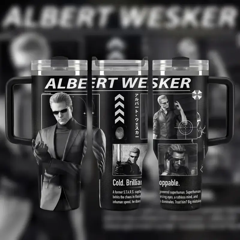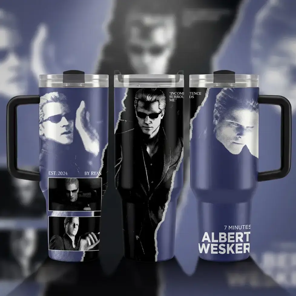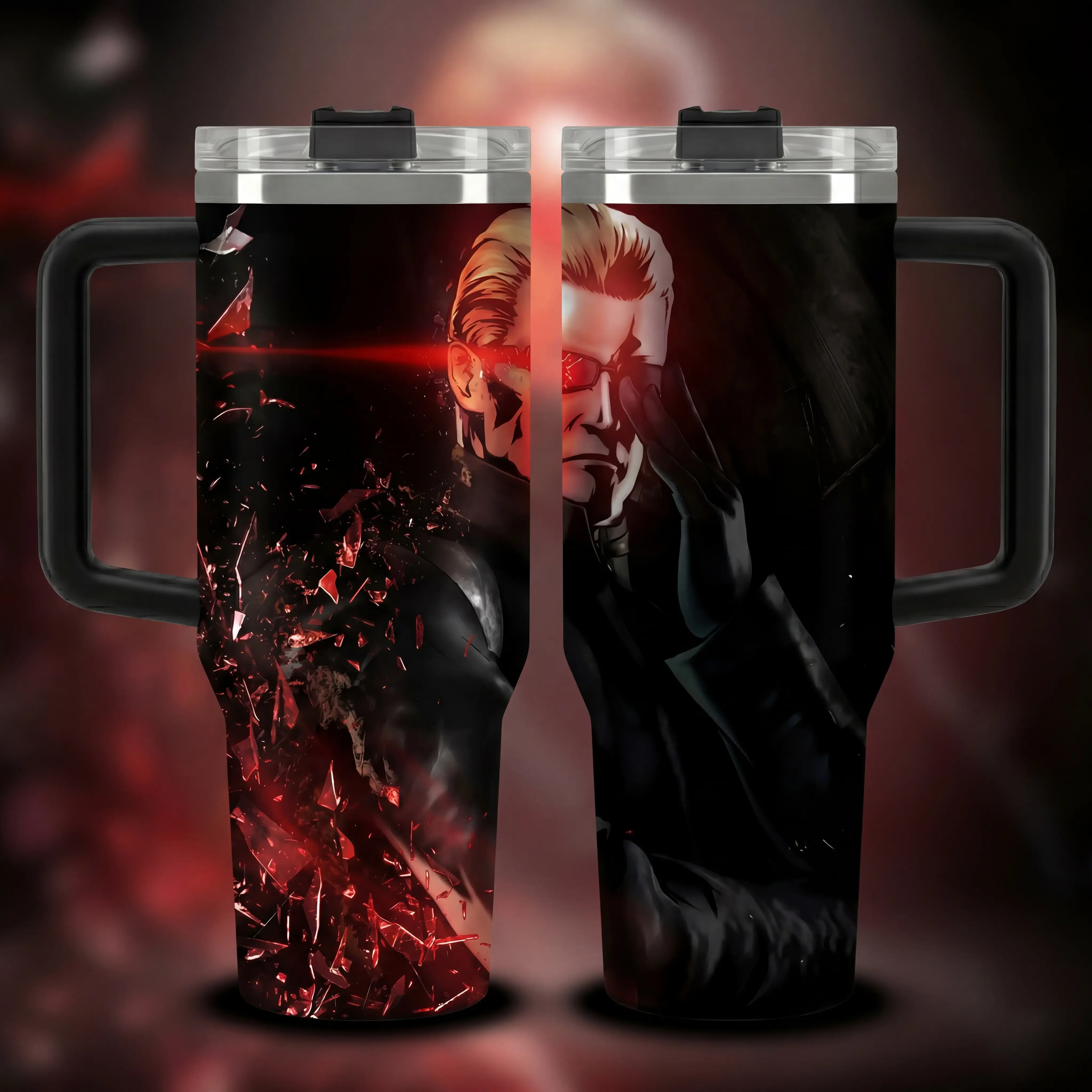 Albert Wesker RE 40oz Tumbler (Theme box not included), Enemy Leon S.Kennedy Resident E Inspired Steel Tumbler, Umbrella Gift For Gaming Lovers Tumbler with Handle, Black Water Bottle
