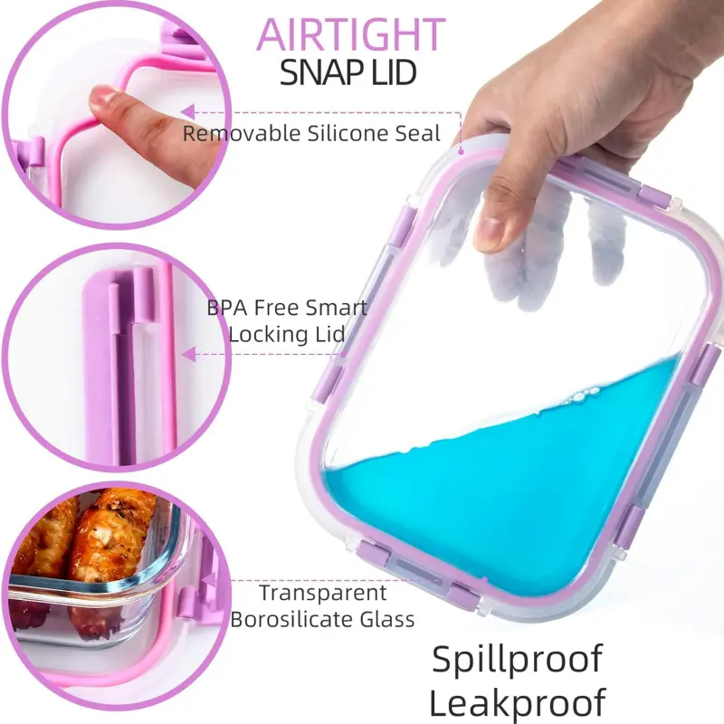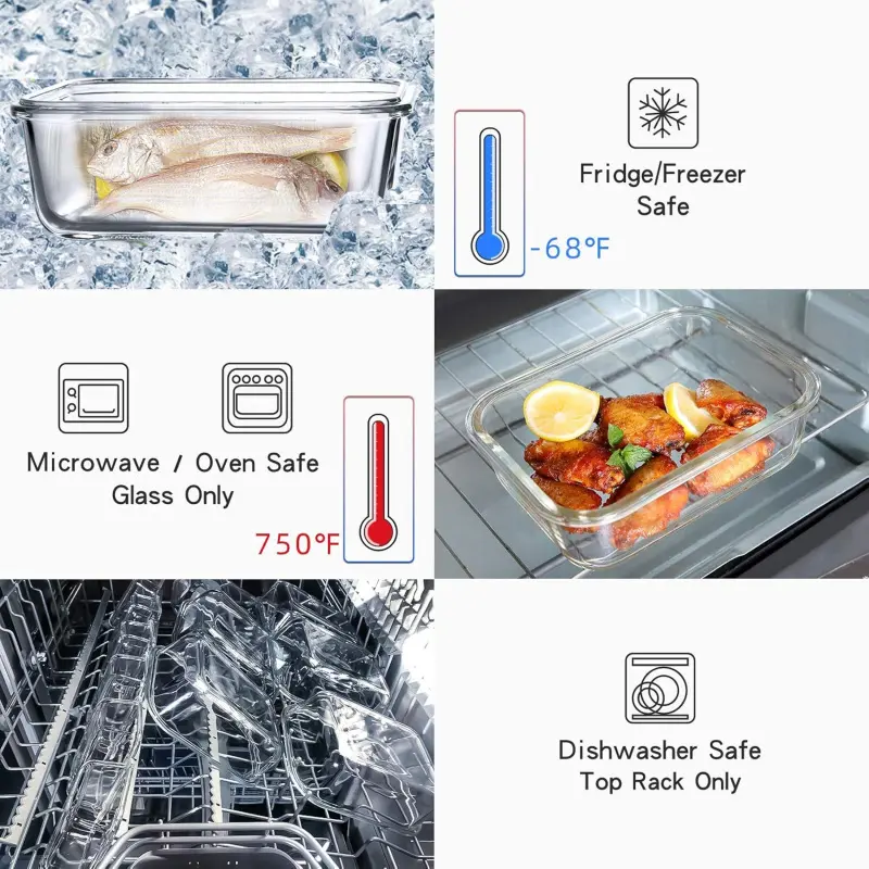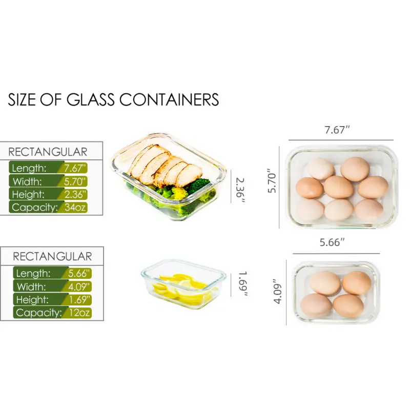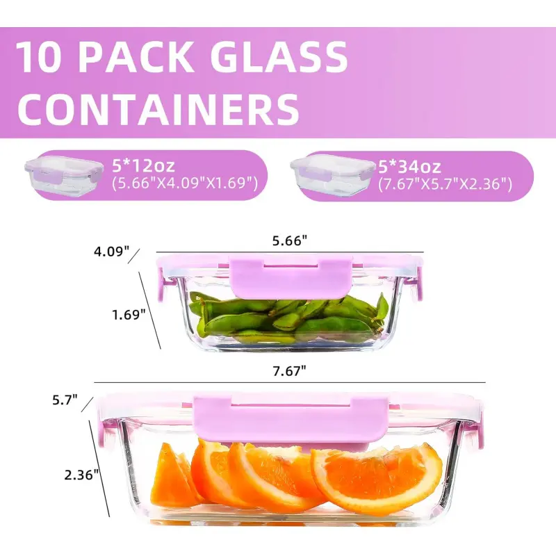 10 PACK GLASS CONTAINER SET - You can get a set of 10 glass storage containers with 2 Capacities: 5*34oz Rectangle & 5*12oz Rectangle. Our glass containers are for a variety of occasions: gym, office, picnic, party, travel, outdoor and indoor. A SAFER OPTION - Made of durable borosilicate glass with transparent lid, lid is crafted of BPA-free plastic, avoid any possibility of leaching. You can use them for freezer storage, microwave ( not the lids) and are oven safe over to 700 ℉ . DISHWASHER SAFE - Glass containers don't stain or hold oils like plastic so they are easy to clean. Also Silicone Seal is removable for easy cleaning, stain and odor resistant. MAGICIAN OF STORAGE ROOM - With an intended design and straight edges, Food containers can be stacked easily with little risk of slipping. See-through pure glass let you tell at a glance what you’ ve stored. Perfectly for a variety of storing needs and take up minimal room for your kitchen.CUSTOMER CARE - These glass food storage containers will be a good helper for serving your everyday goals, storage your prep food, organize your kitchen. If any CRACKS or PRODUCT DEFECTS upon receiving, please let us know. We will help you within 24 hours.