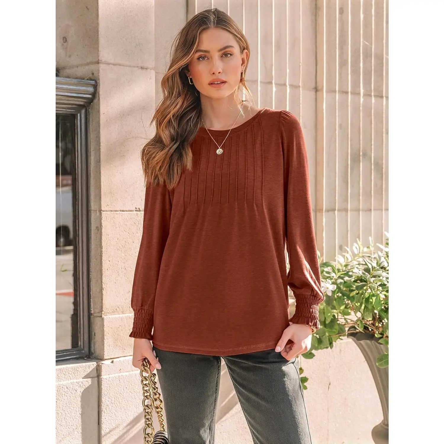 All-Day Comfort for Work & Life - Crafted from a blend of 60% polyester, 35% rayon, and 5% spandex, this top offers exceptional softness and flexibility. The breathable fabric moves with you throughout your busy day, providing cloud-like comfort during long office hours or weekend activities. Elegant Details, Versatility - Featuring a sophisticated pleated front and delicate smocked cuffs, this top elevates your professional wardrobe. The medium-weight fabric makes it for fall weather - wear it alone outdoors or layer it under your favorite trench coat when temperatures drop, then comfortably remove layers in heated indoor spaces. Effortless Transition from Desk to Dinner - With its classic silhouette enhanced by contemporary pleating, this top masters both dressy and casual occasions. Pair it with a midi skirt for a romantic date night or with your favorite jeans for casual weekend events - its versatile design ensures you're appropriately styled for any setting. Festive Ready in Signature Colors - Our bestselling Maple and Wine shades create the canvas for your holiday outfits. These rich, versatile tones pair beautifully with seasonal red accessories, making them ideal for Thanksgiving gatherings and Christmas parties. The elegant pleating adds just the right amount of celebration to your festive look.MACHINE WASH COLD, TUMBLE DRY LOW: To maintain your apparel's vibrant color we recommend machine washing with laundry bag on cold. Size: please refer to size chart above the description for details before Purchase.
