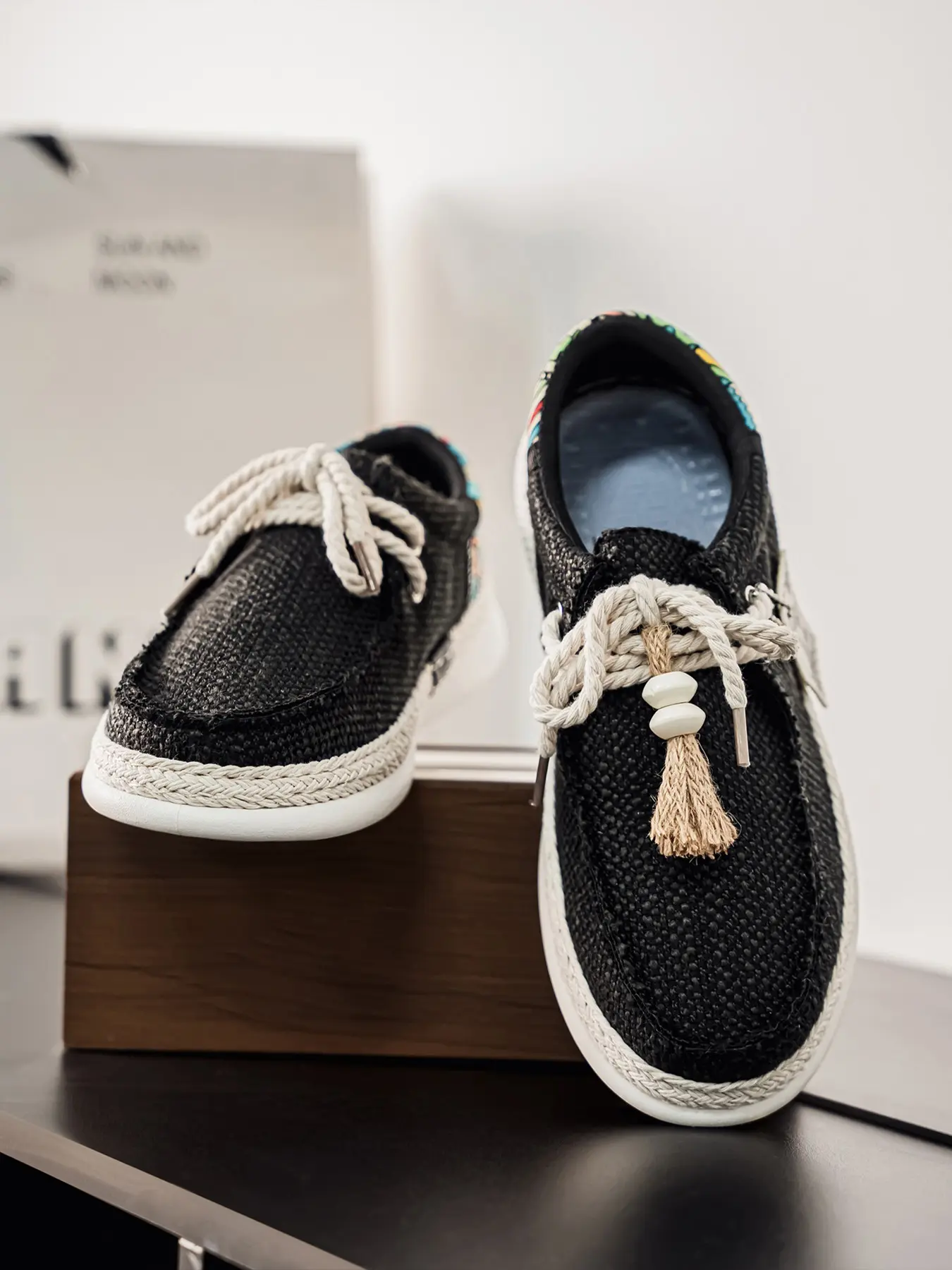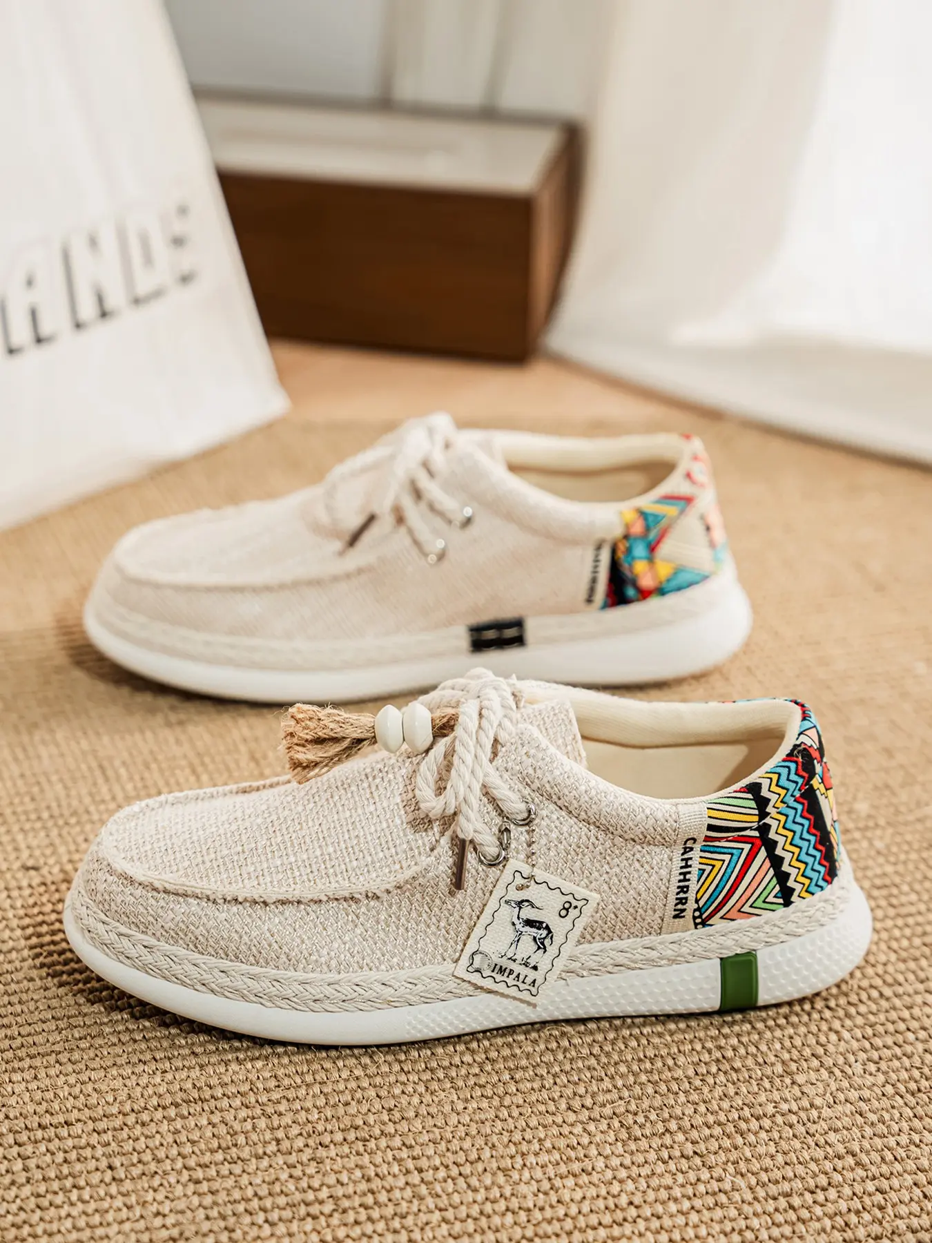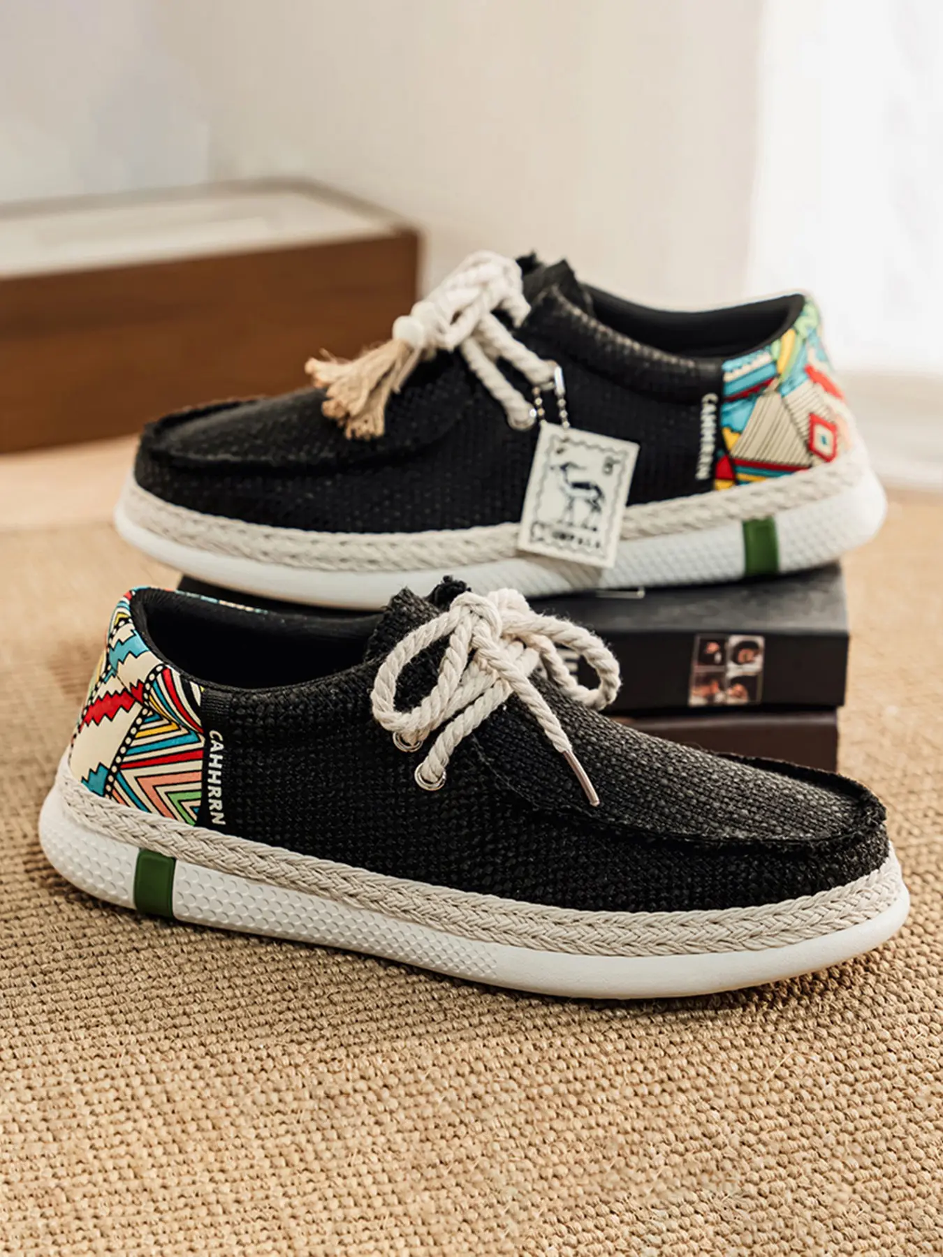 Summer New Men's Linen Shoes, Breathable Non-Stuffy, Colorblock Geometric Pattern, Fringe Decor, Retro Ethnic Style, Comfortable Thick Sole