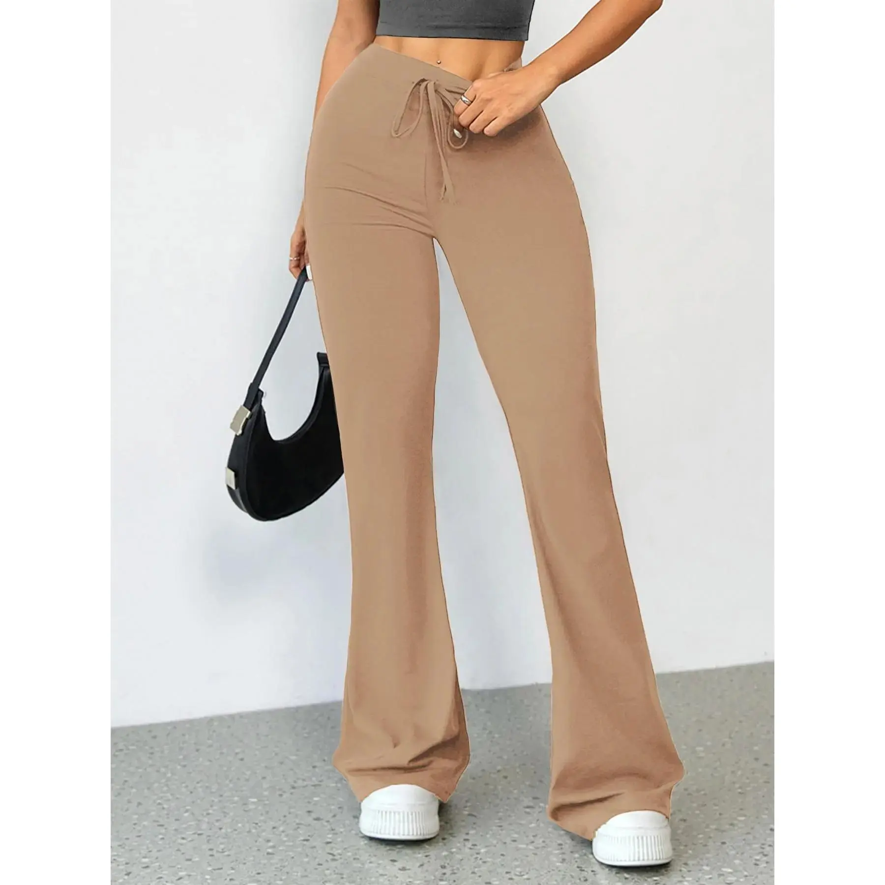 Women's High Waist Flare Leg Sports Tummy Control Leggings, Solid Color Drawstring High Stretch Yoga Leggings, Gym Clothes, Ladies Sportswear for Indoor Outdoor Wear, Gym Yoga Pants