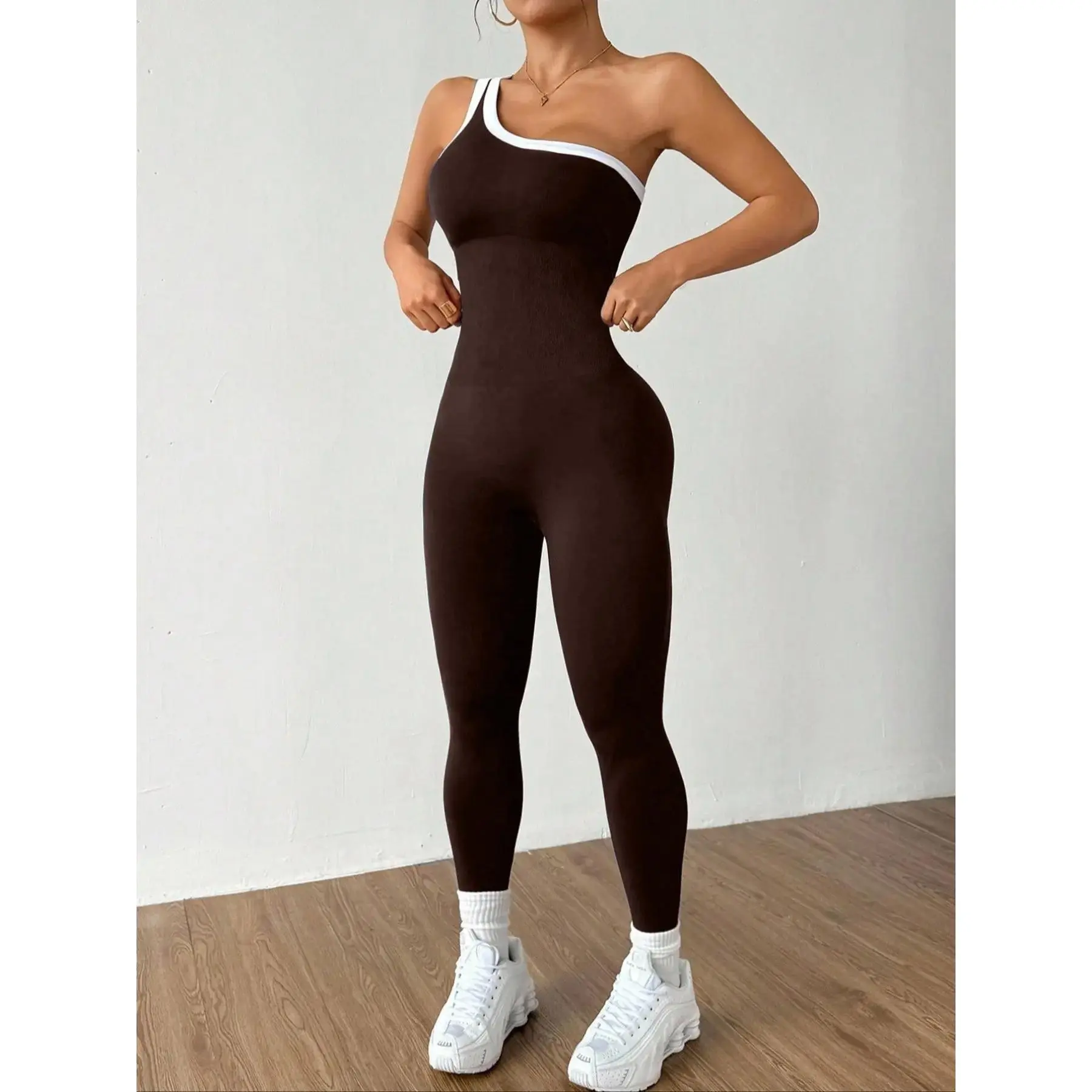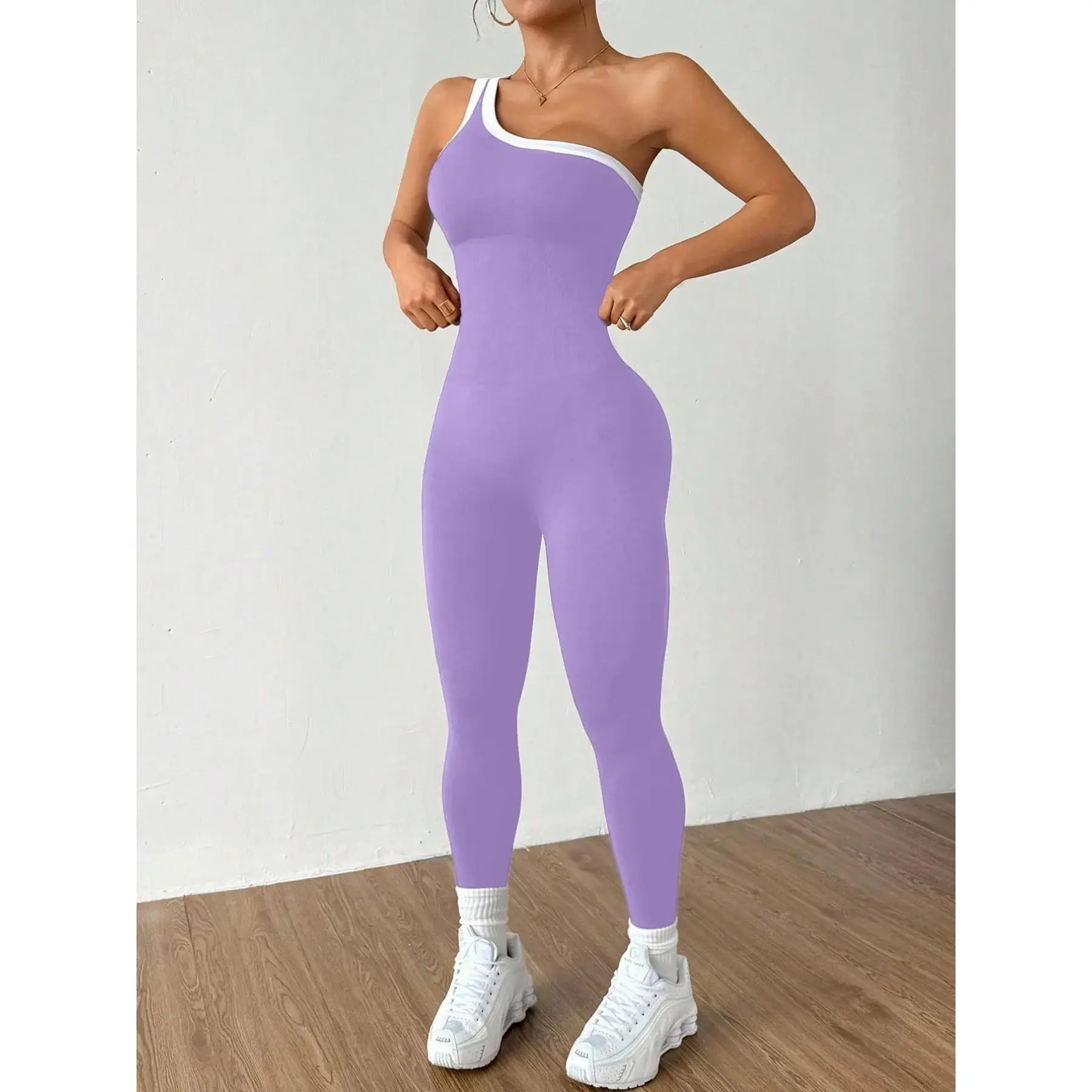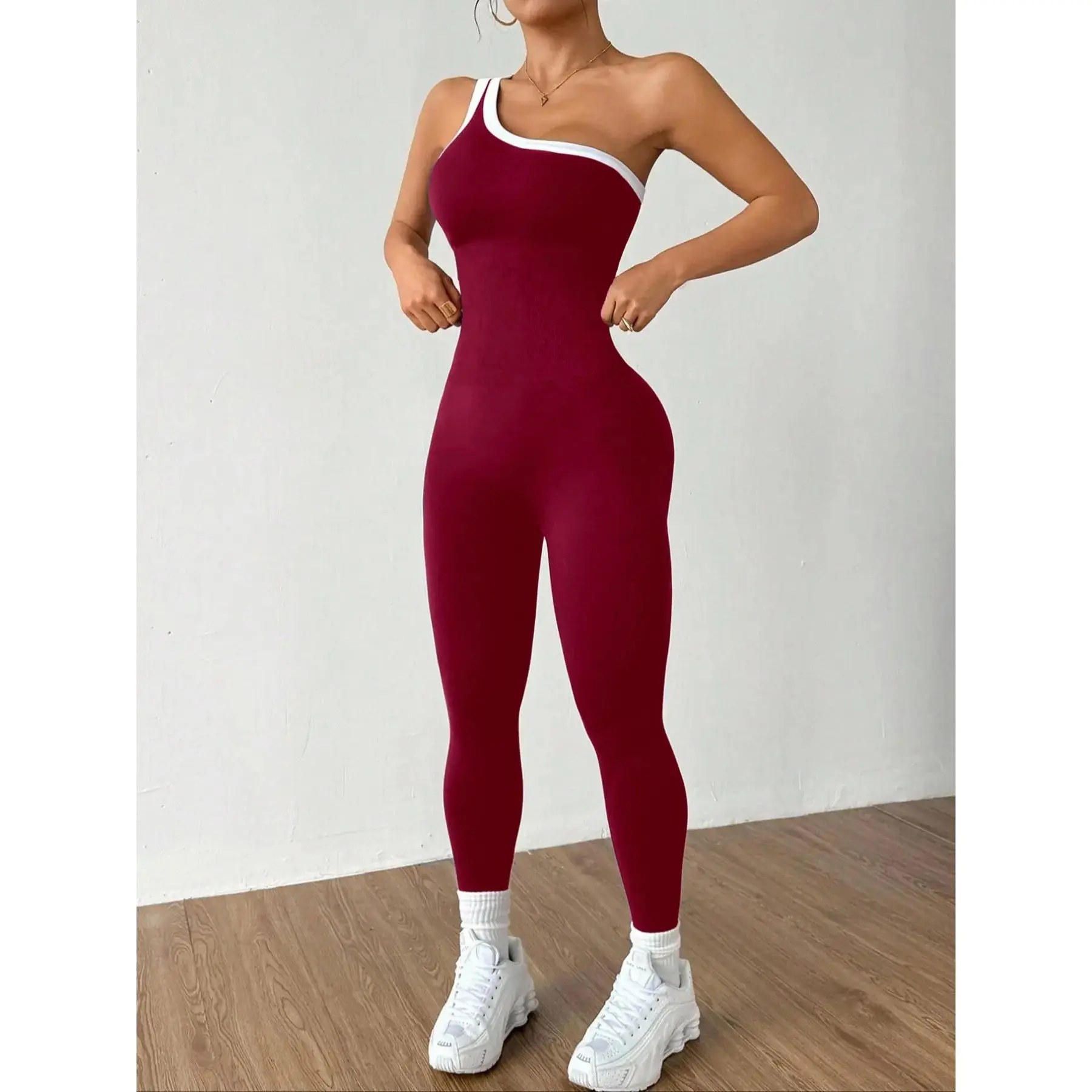 Women's Colorblock Asymmetrical Neck Sleeveless Knit Yoga Jumpsuit, Casual Slim-Fitting Long Sleeve Top for All Seasons