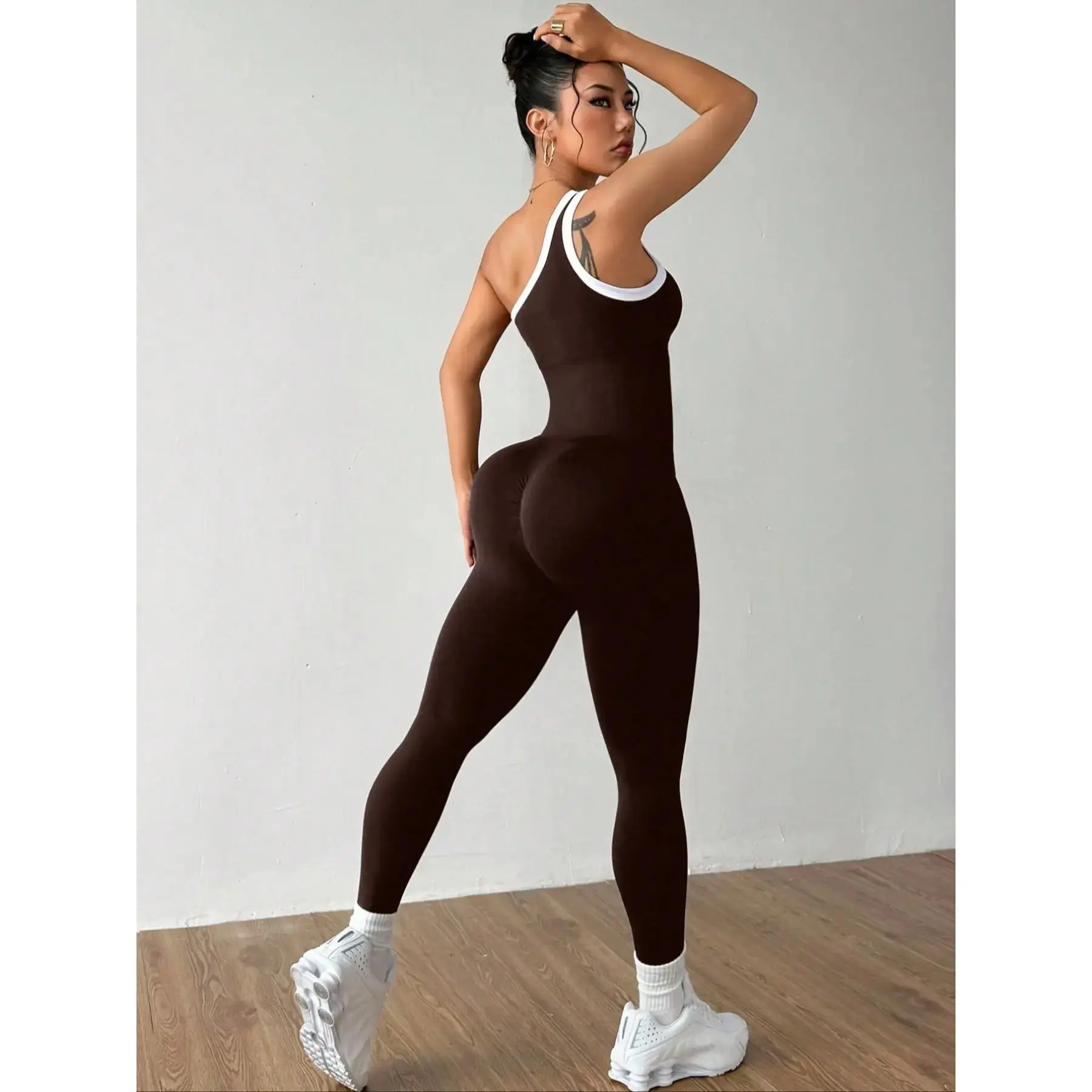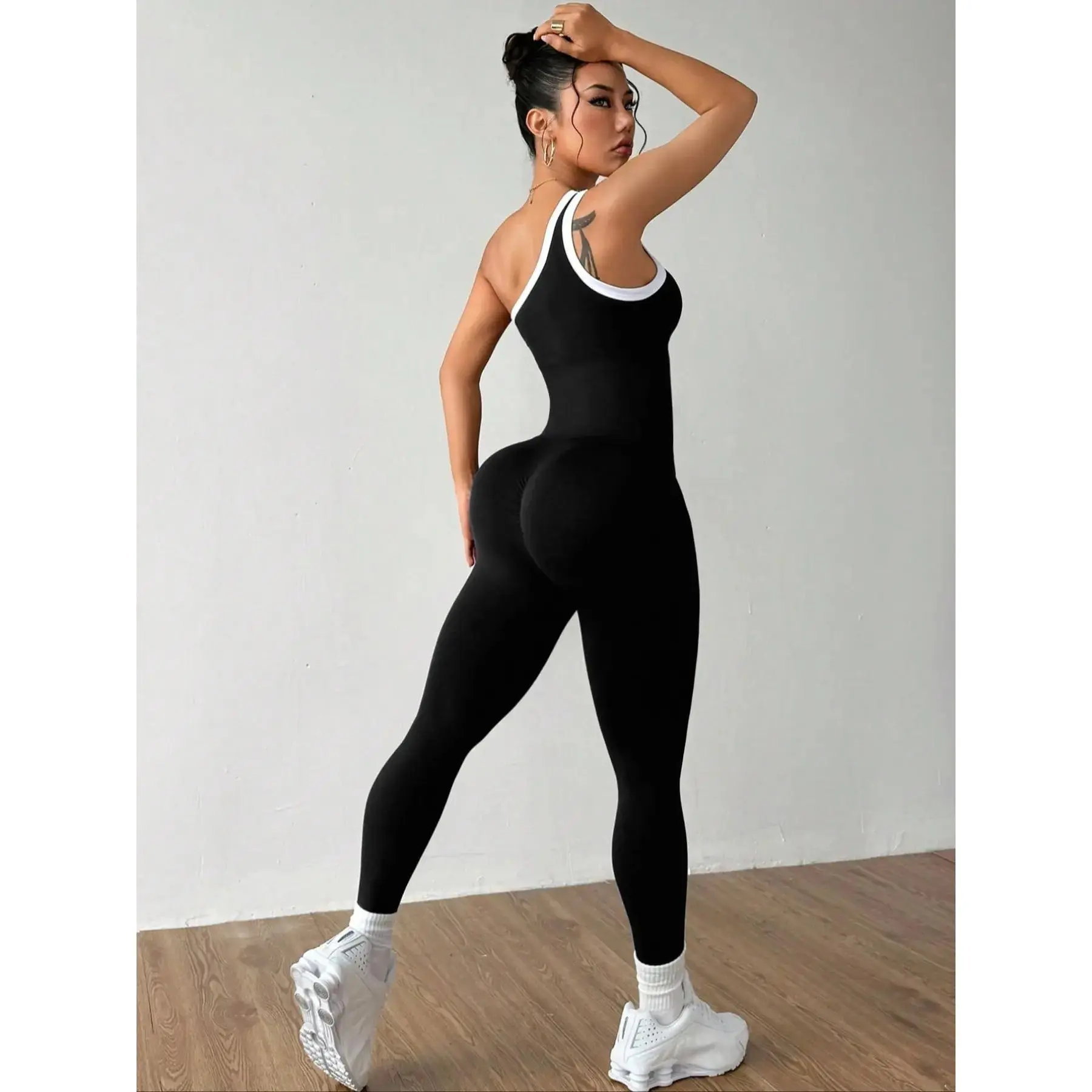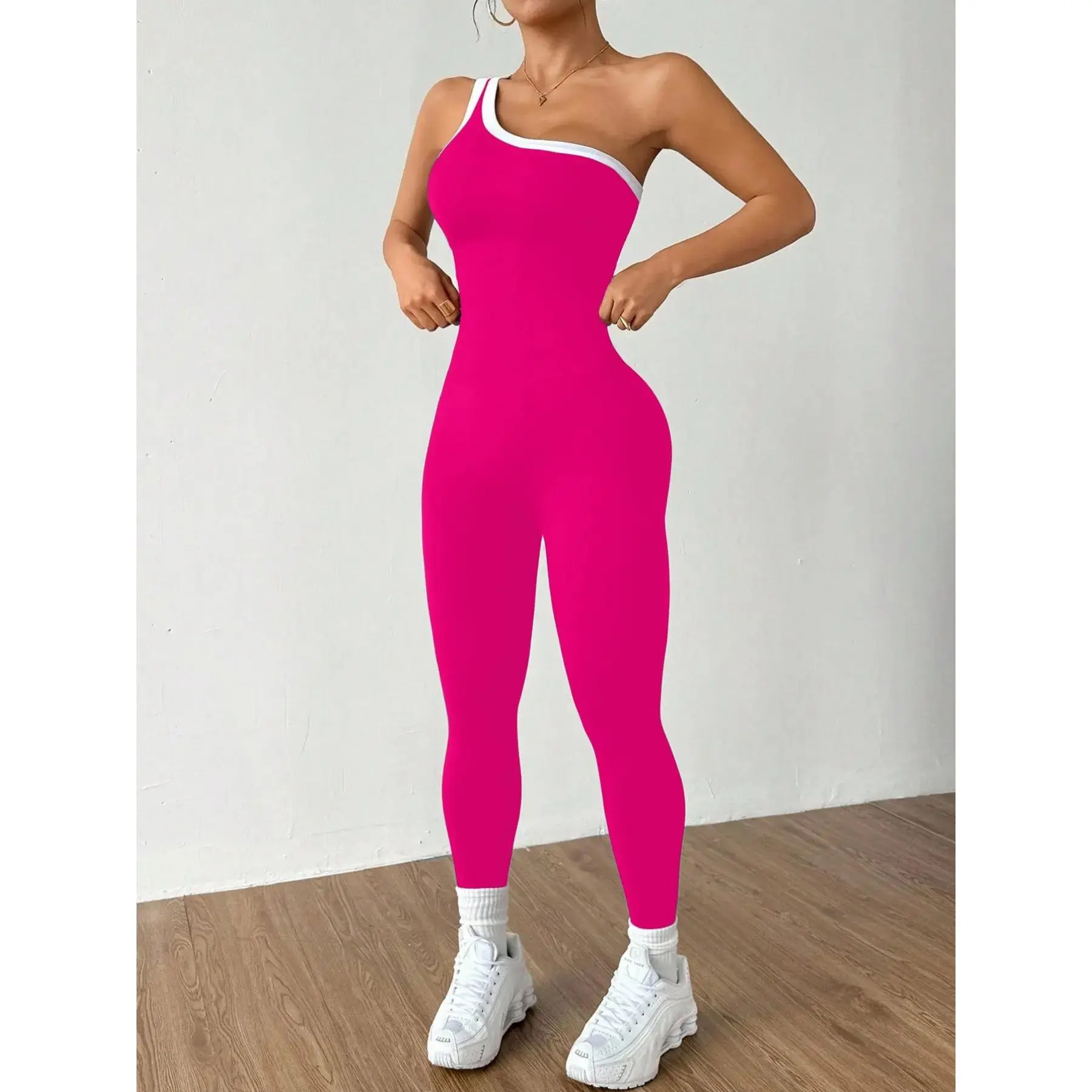 Women's Colorblock Asymmetrical Neck Sleeveless Knit Yoga Jumpsuit, Casual Slim-Fitting Long Sleeve Top for All Seasons