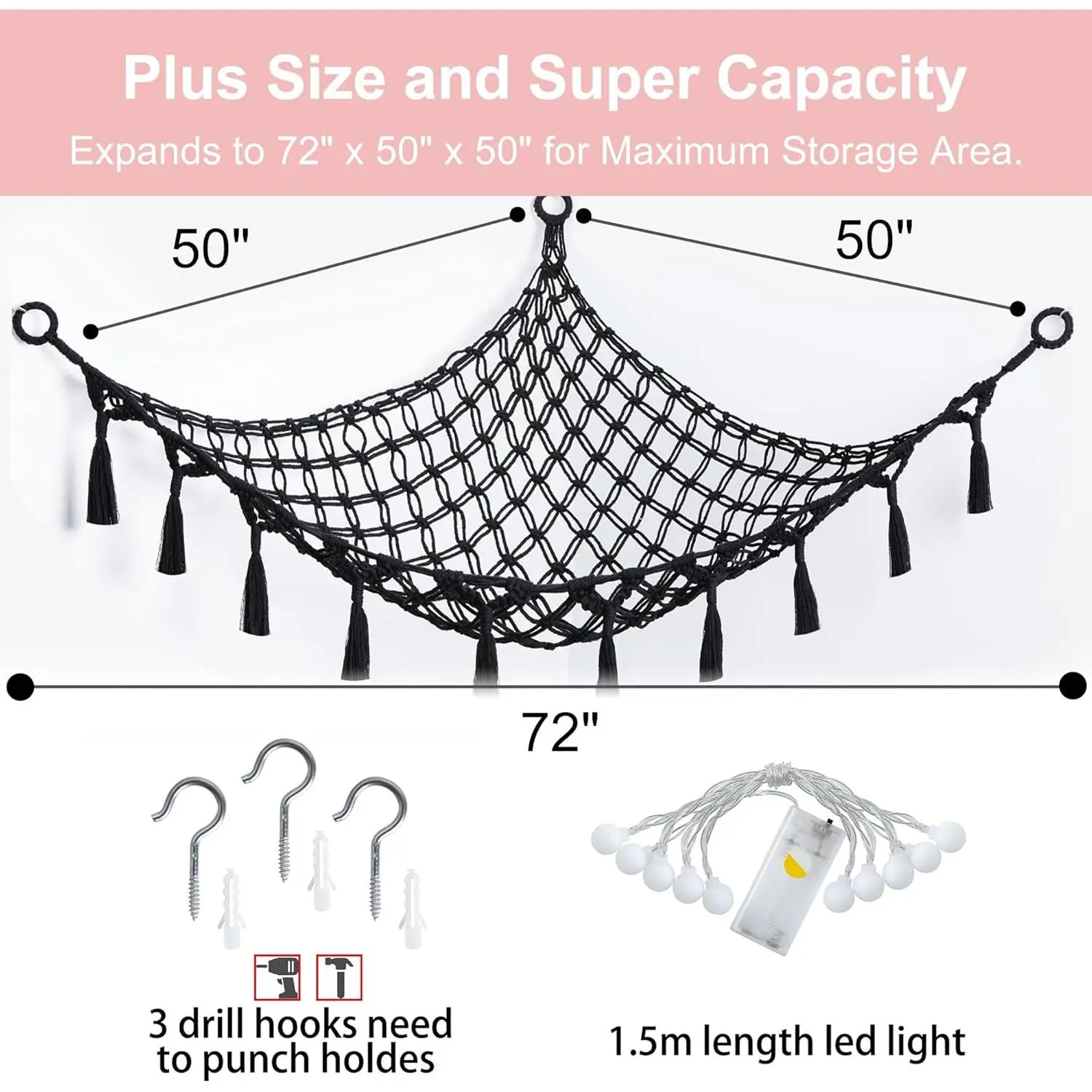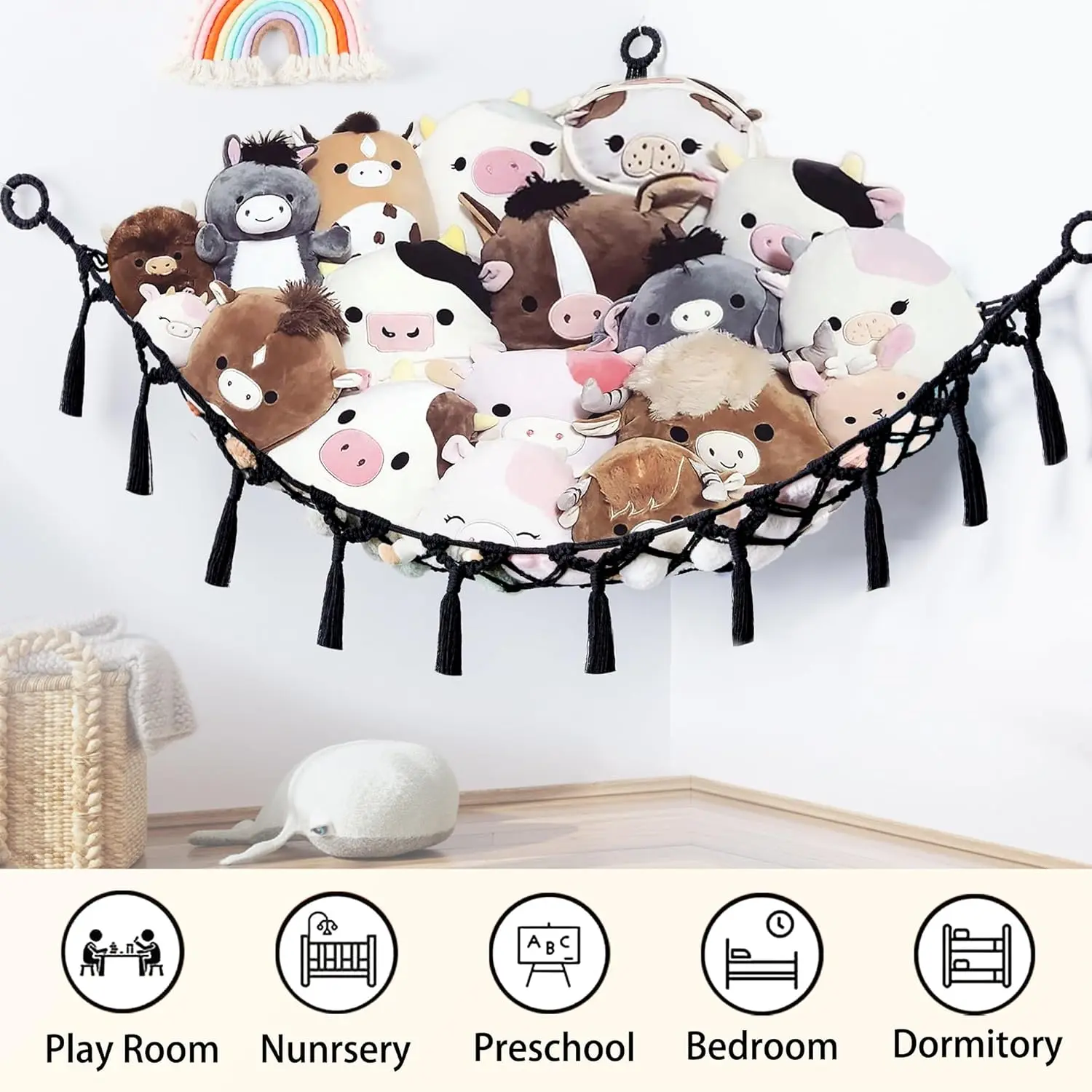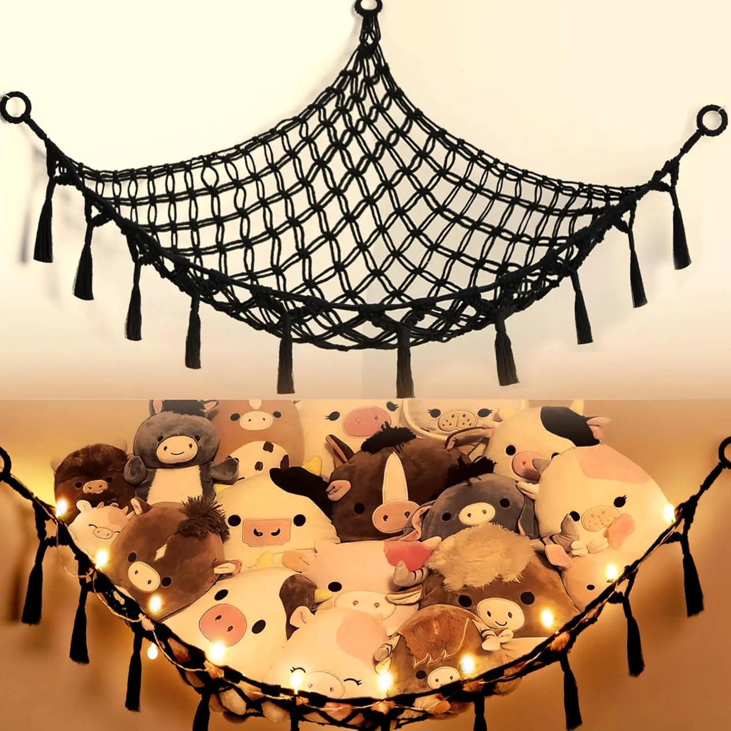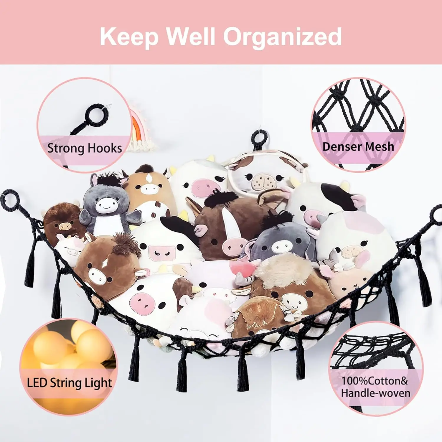 Stuffed Animal Net or Hammock with Light, Macrame Hanging Net Hammock for Stuffed Animal Toy Storage Organizer Boho Decor Room Holder for Nursery Play Room Bedroom (Black(55"*55"*72"))