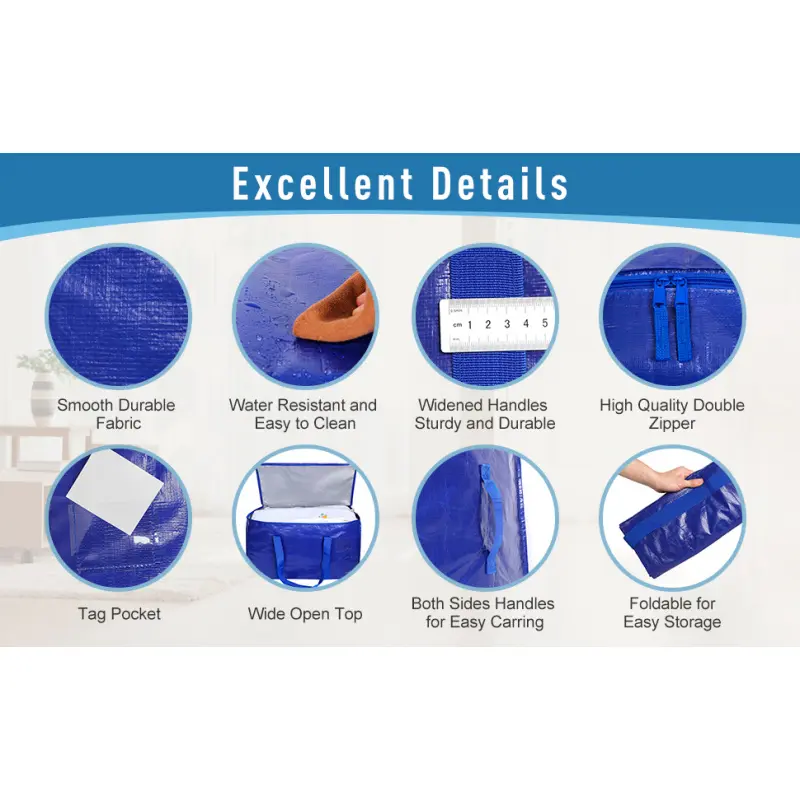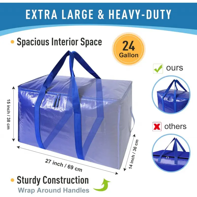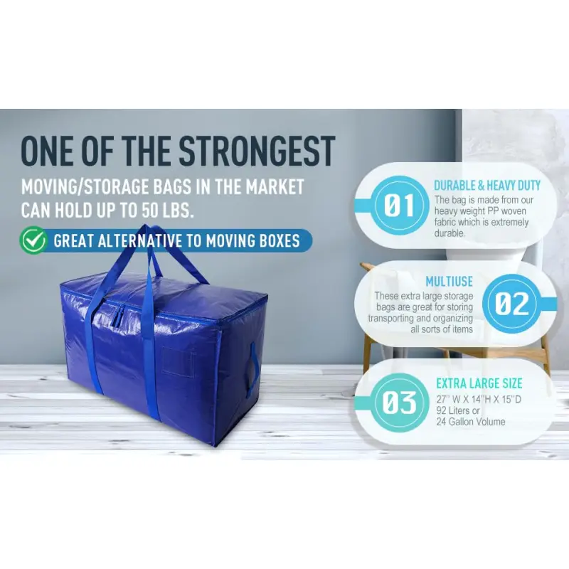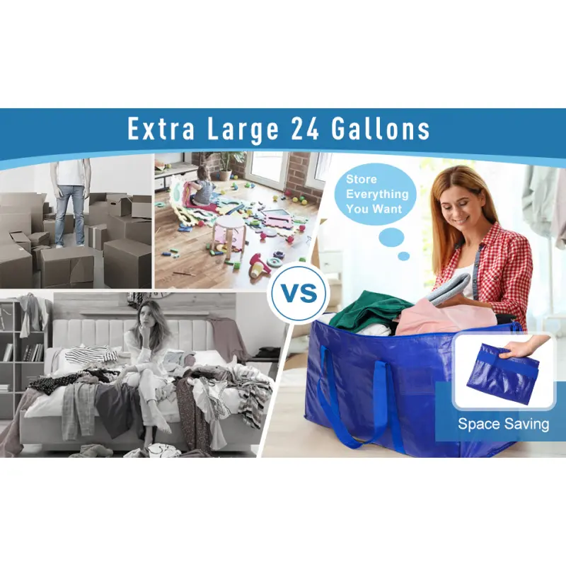 []: The moving bags size:27" W x 14" H x 15" D, 24 Gallon Volume.Oversize and super large capacity to fit clothes, bedding, comforters, blankets, books, toys.Long handle and zipper Waterproof material More efficient storage bags for moving! [HEAVY DUTY]: Sturdy construction safely supports 50 lbs. Made of high-grade, water-resistant, thick polypropylene woven fabric material which is durable. Protects from moisture, humidity, dust, and dirt. Strong and long poly webbing carrying handles are reinforced for extra strength, security, and durability. Heavy-duty side handles make the bag easy to transport. A premium dual tab zipper goes around the bag allowing the top to open wide for easy loading and unloading. [MOVING BOX ALTERNATIVE]: The moving totes is lightweight, economical, and convenient. Can be alternative to large moving boxes or plastic moving bin containers. No need to buy boxes or look for packing bag for moving. Can be folded flat into a small size when not in use. Stack up and easy storage in your drawer, closet, cabinet, car, shelf, or luggage. Classic navy blue color. Reusable for future use to help protect the environment. [TAG POCKET]: A convenient clear tag pocket locate on the front right side for customized label.Allow you to easily organize, recognize, and locate your items for quick and efficient retrieval. [MULTI FUNCTIONAL]: Used for moving, storing, transporting, laundry, camping, traveling, organizing, space saving, small trips, etc. for moving into your new apartment or college dorm room. Storing pillows, towels, quilts, decorations, shoes, sleeping bags, camping gear, laundry, throws, cushions, linens, purses, inflatable beds, backpacks, workout gear. Can be stored in your closet, garage, basement, attic, or storage unit. It’s the moving essentials!