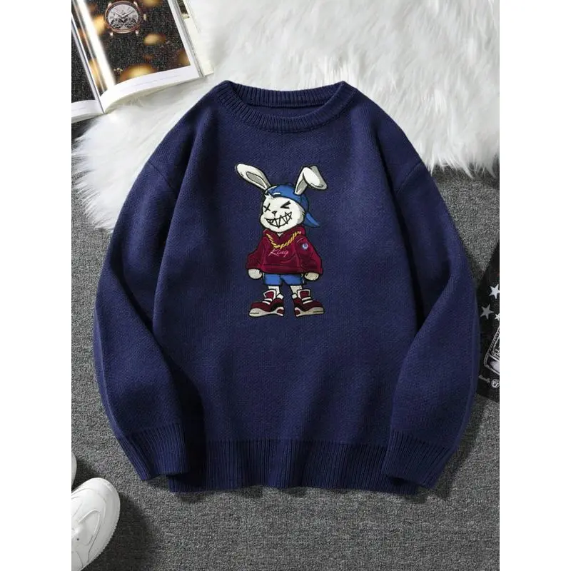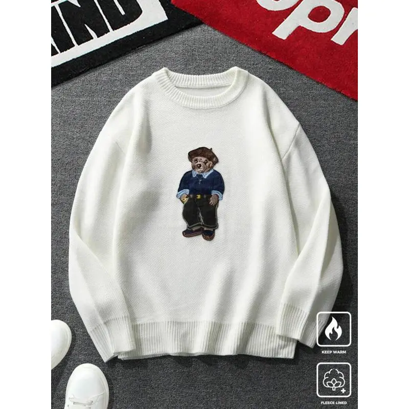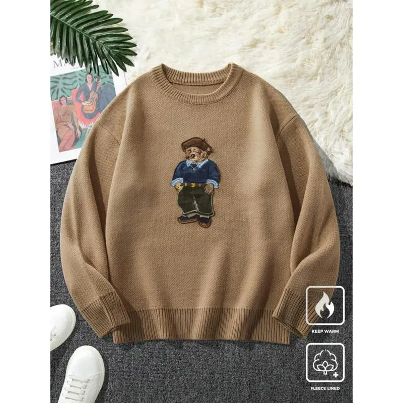Unisex Cartoon Bear Print Crew Neck Sweater Crewneck, Casual Loose Long Sleeve Jumper For Fall & Winter, Fashion Ladies' Knitwear For Daily Wear