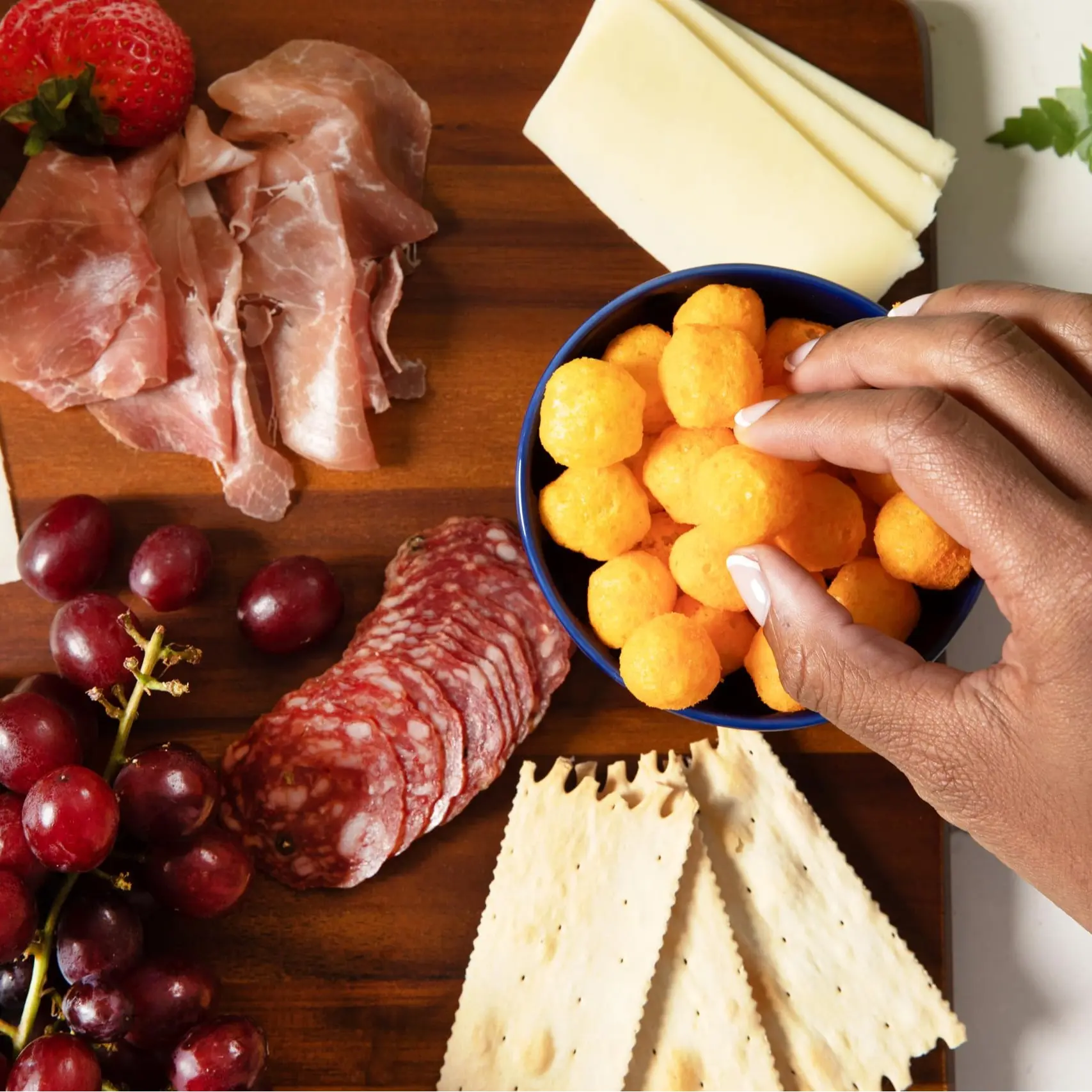 These cheese balls are made from puffed corn and seasoned with cheddar flavor, offering a light and crunchy texture with a savory taste.