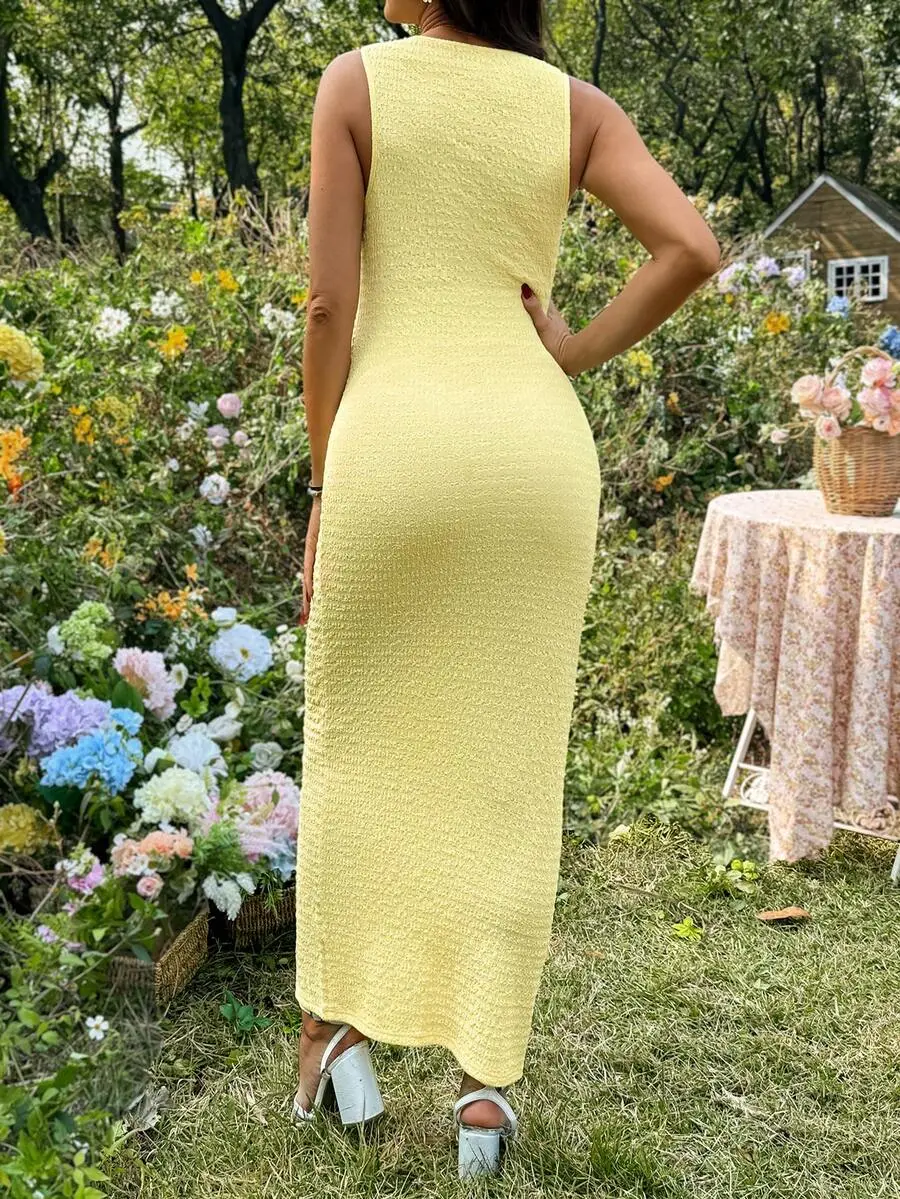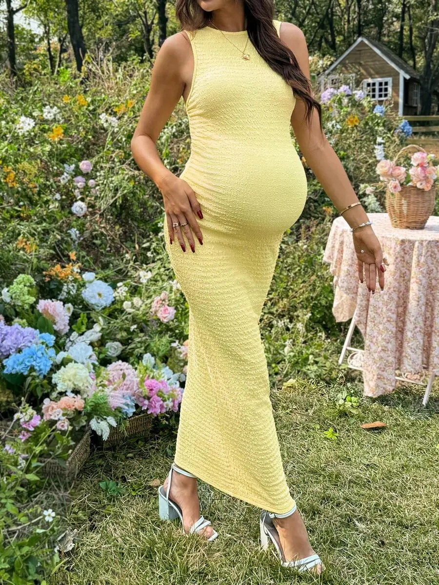 TAMALLA Maternity Solid Color Minimalist Sleeveless Casual Dress Yellow Maternity Dress Baby Shower Yellow Midi Dress Yellow Bodycon Dress Yellow Dress Curve Knit Maxi Dress