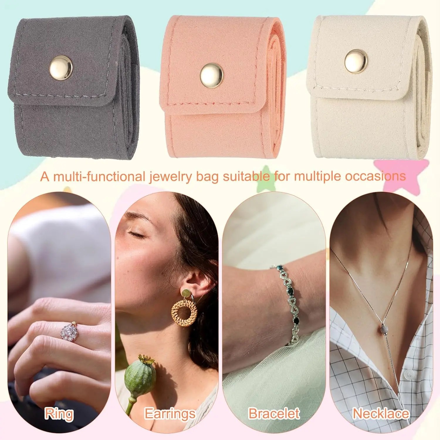 【Comfortable and skin friendly material】This mini jewelry bag is made of leather velvet, with a soft and delicate touch. The leather outer layer is wear-resistant and durable, while the inner lining is made of soft velvet fabric, which can cushion and protect your jewelry from scratches or damage, avoiding scratches and wear during storage, effectively protecting the gemstone luster and metallic texture