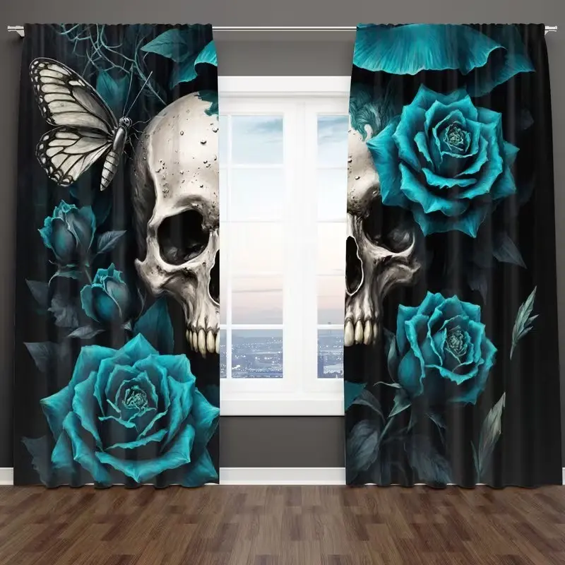 5. 2 pieces of Gothic skull and greenish-blue rose printed curtains, made of polyester with semi-transparent texture, machine washable, suitable for bedrooms, living rooms and home decoration curtains.