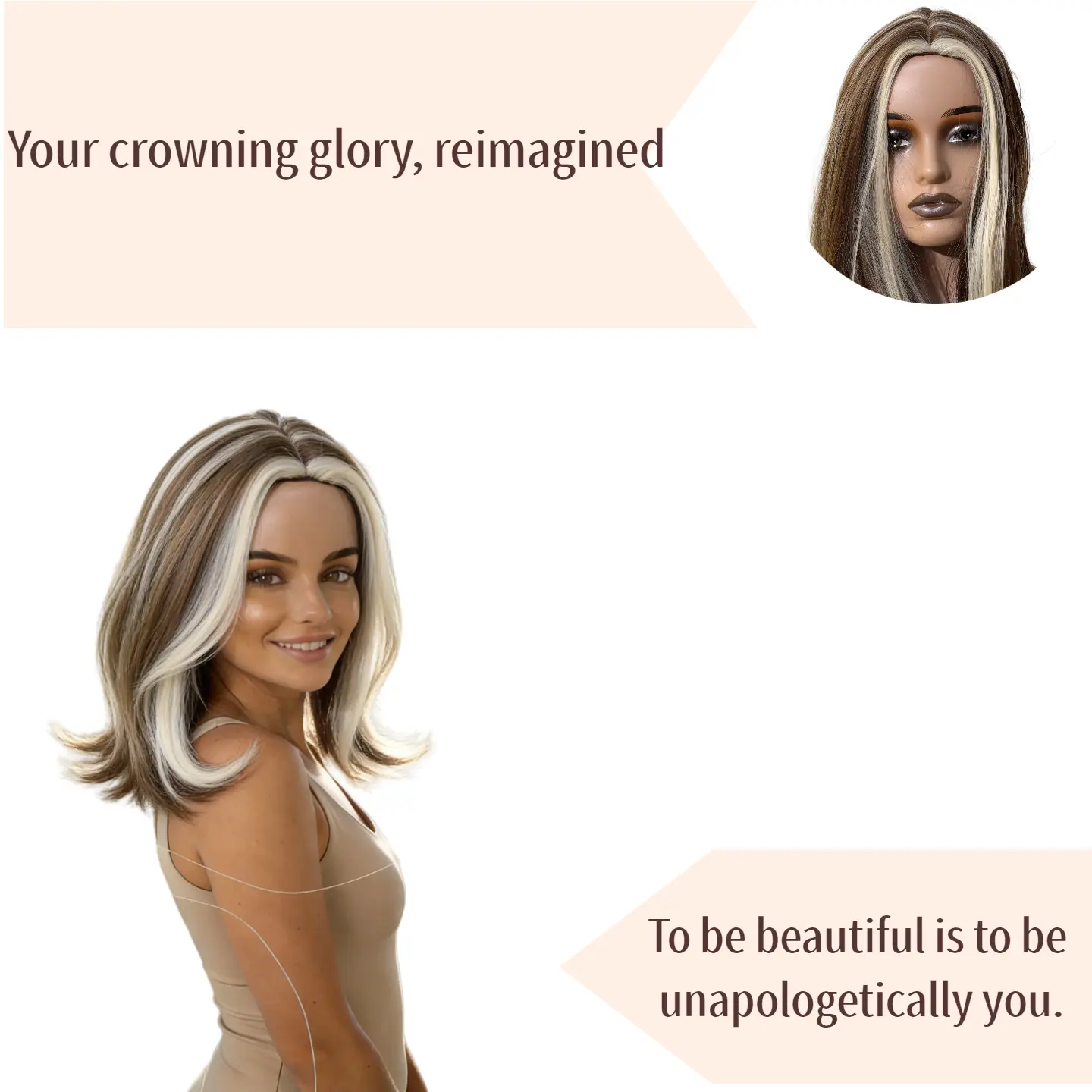 Piano-Color Wig — Women's Light Brown Wig with White Highlights, 19 Inches — Suitable for Daily Wear and Parties