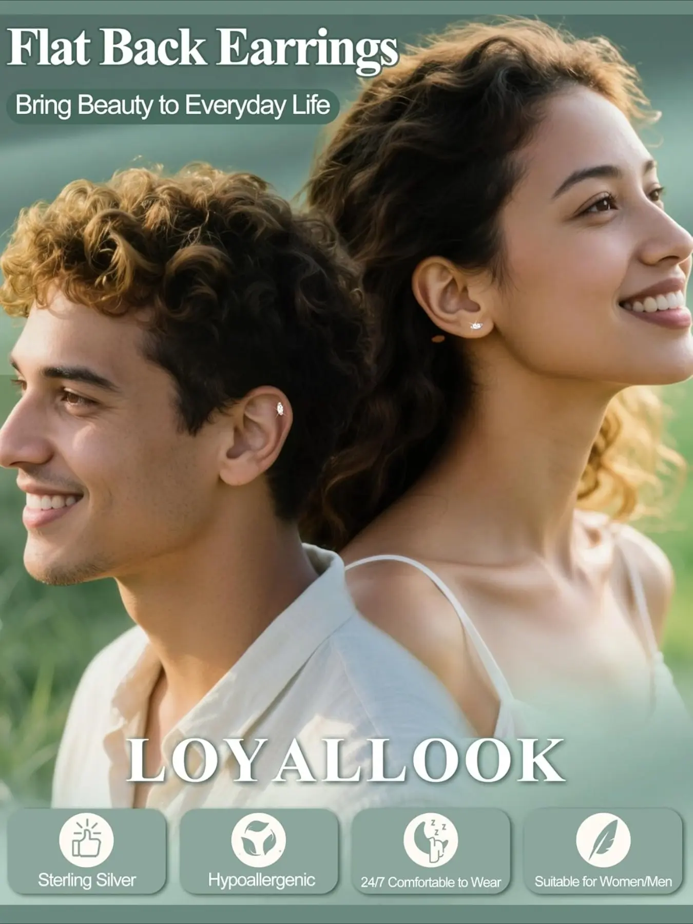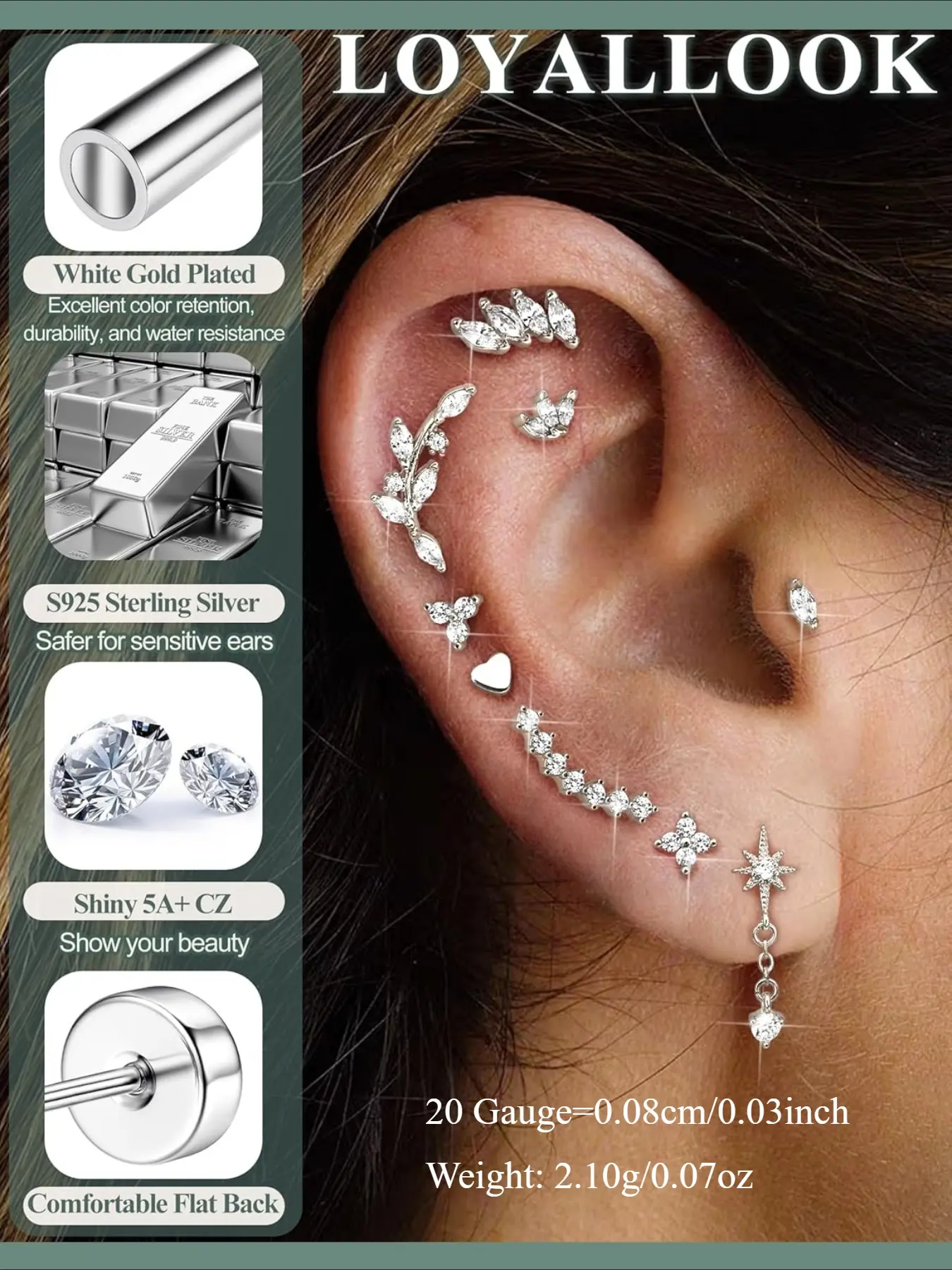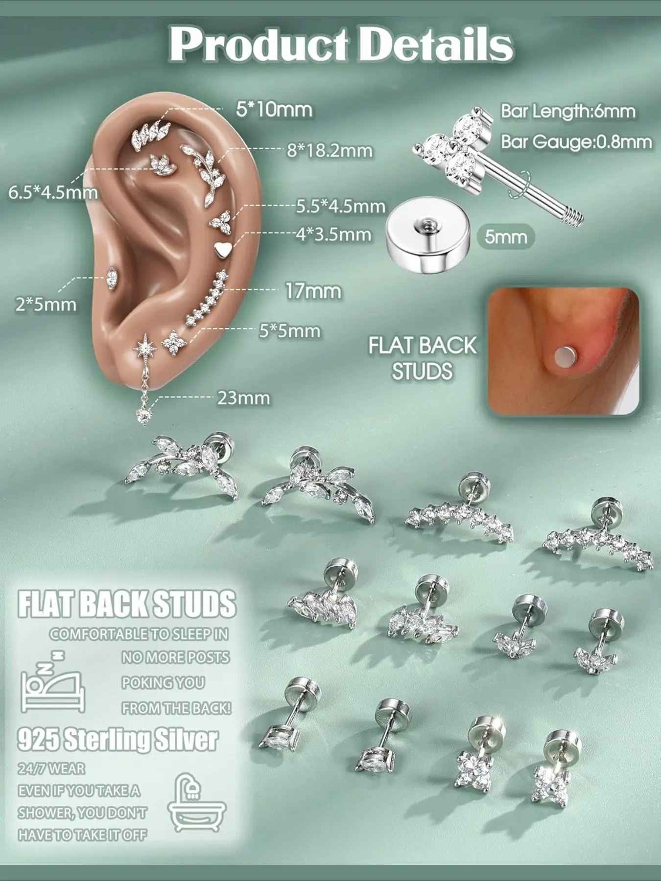 925 Sterling Silver Flat Back Stud Earrings for Women, Hypoallergenic 14k, Small Cz Helix Conch Tragus Piercing Jewelry 20g