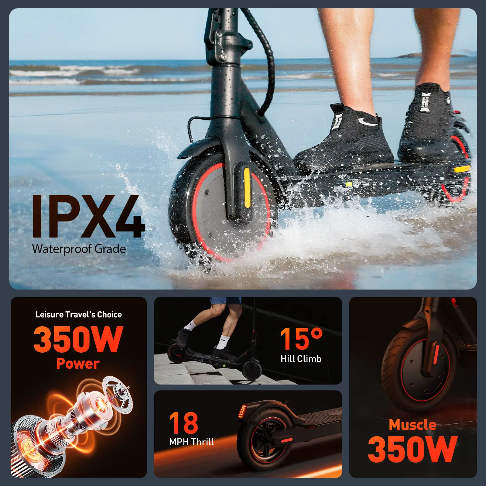 ·8.5-inch air-filled tires provide shock absorption and grip, easily climbing 20° slopes.With an IP65 waterproof rating, it withstands splashes and light rain.🌧️