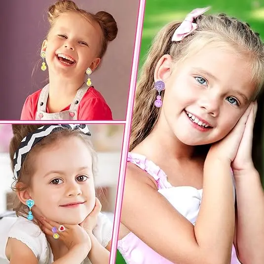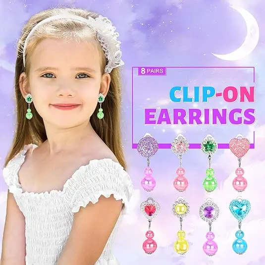 ·CLIP ON EARRINGS SET: A variety of earrings for girls in different styles, featuring colorful gemstone earrings and sparkling rhinestone designs. These earrings are selected from the most popular toy shapes, offering endless options for creative play