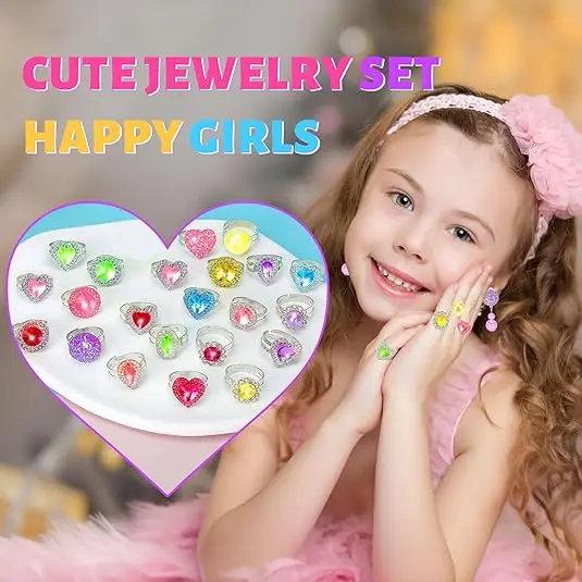 ·SPARKLY KIDS JEWELRY FOR GIRLS, VALENTINE GIFTS FOR KIDS: Includes 20 unique rings and 6 pairs of clip on earrings with colorful acrylic gems that shimmer and shine, sparking your little one’s imagination. Perfect for custom jewelry set to suit every little princess’s style