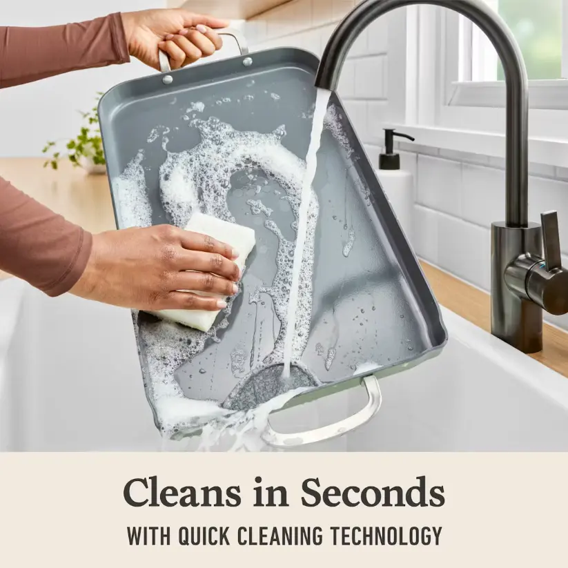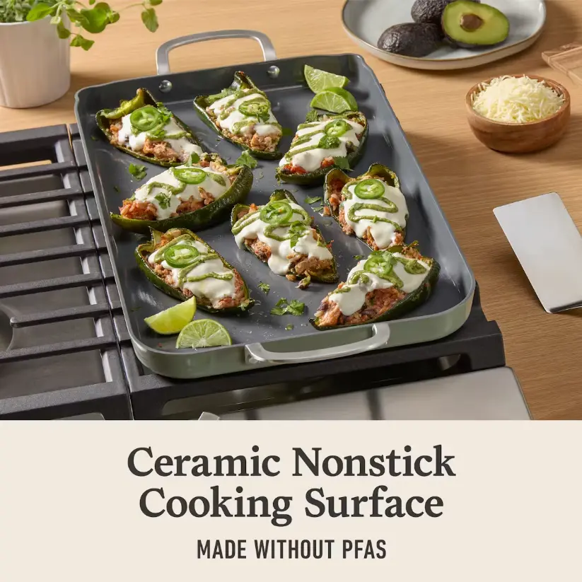 Feed your passion for cooking and style, with Calphalon Ceramic Nonstick cookware. Perfect for everyday cooking, this griddle pan is designed to take your culinary adventures to the next level. Cookware cleans in seconds with Quick Cleaning Technology that keeps foods from sticking, so you can spend more time cooking, less time cleaning. Its durable ceramic nonstick coating lets you cook without added oil or butter, for a healthier way to make your favorite foods, and is made without PFAS. Interiors are scratch resistant and metal-utensil safe. Stainless steel handles stay cool on the stovetop; while pans and tempered glass lids are oven safe up to 450 degrees F for stovetop-to-oven versatility. Sturdy ceramic-coated aluminum construction provides fast, even heating for consistent cooking results. The Calphalon Ceramic Nonstick griddle pan is the kitchen essential every home chef needs for making fluffy pancakes, crispy bacon, juicy burgers, and more.