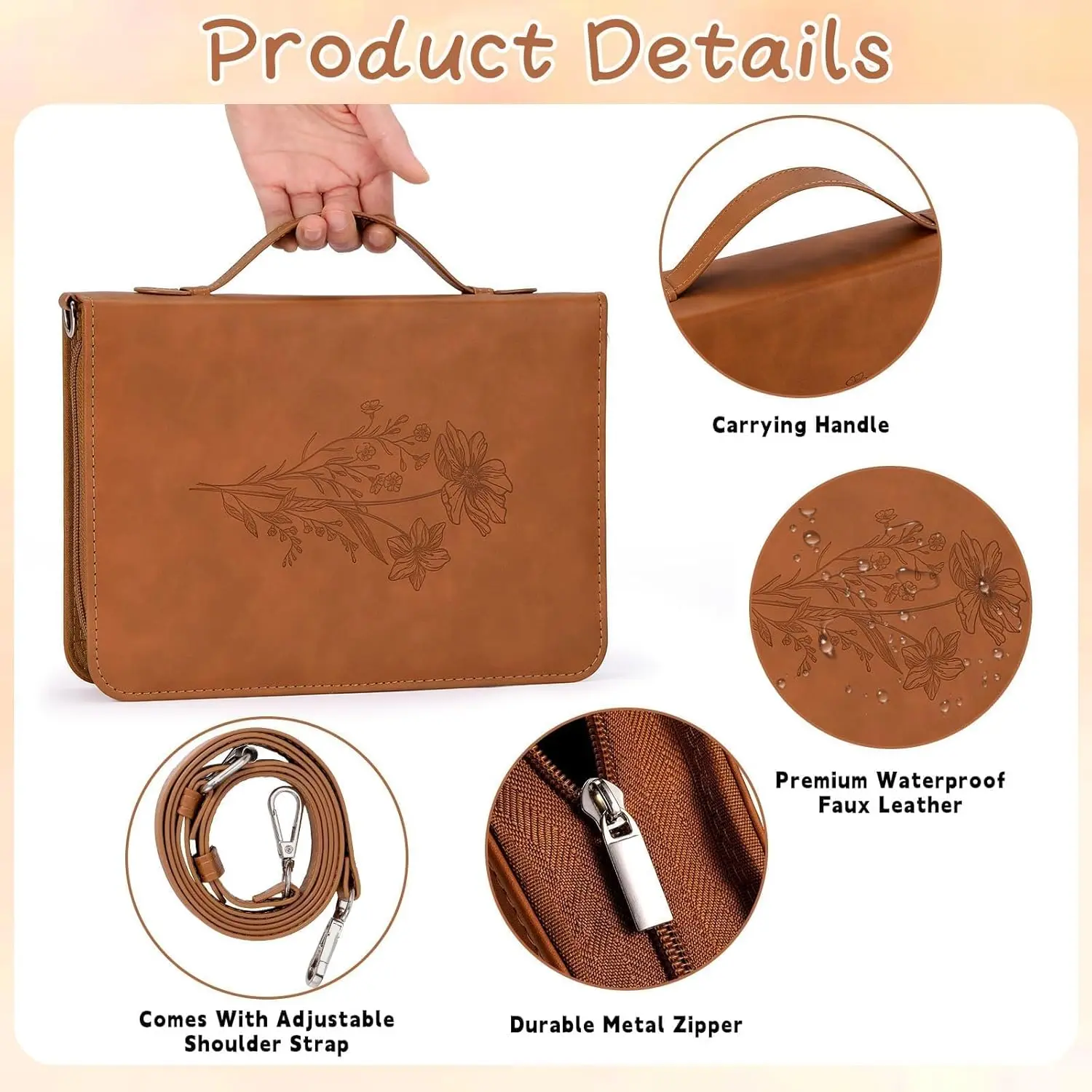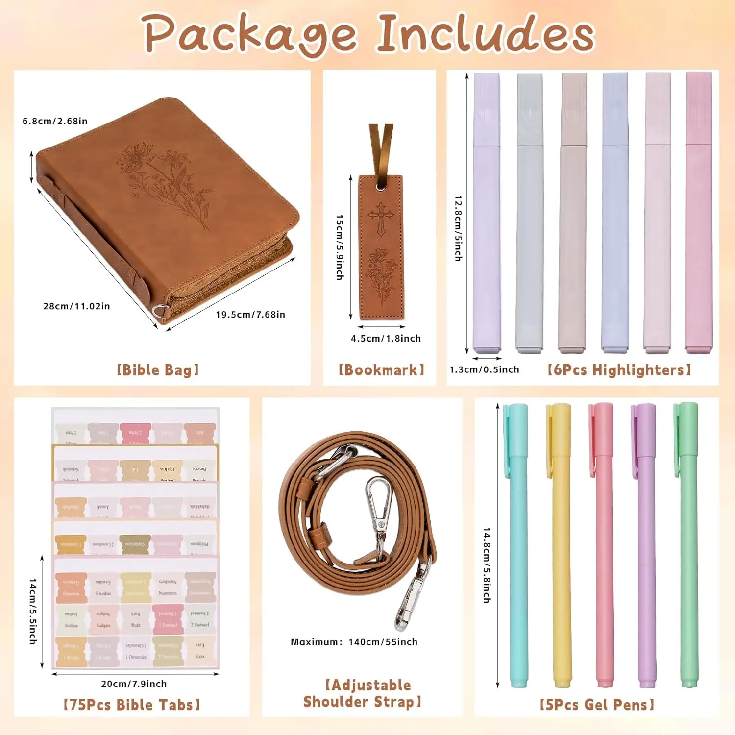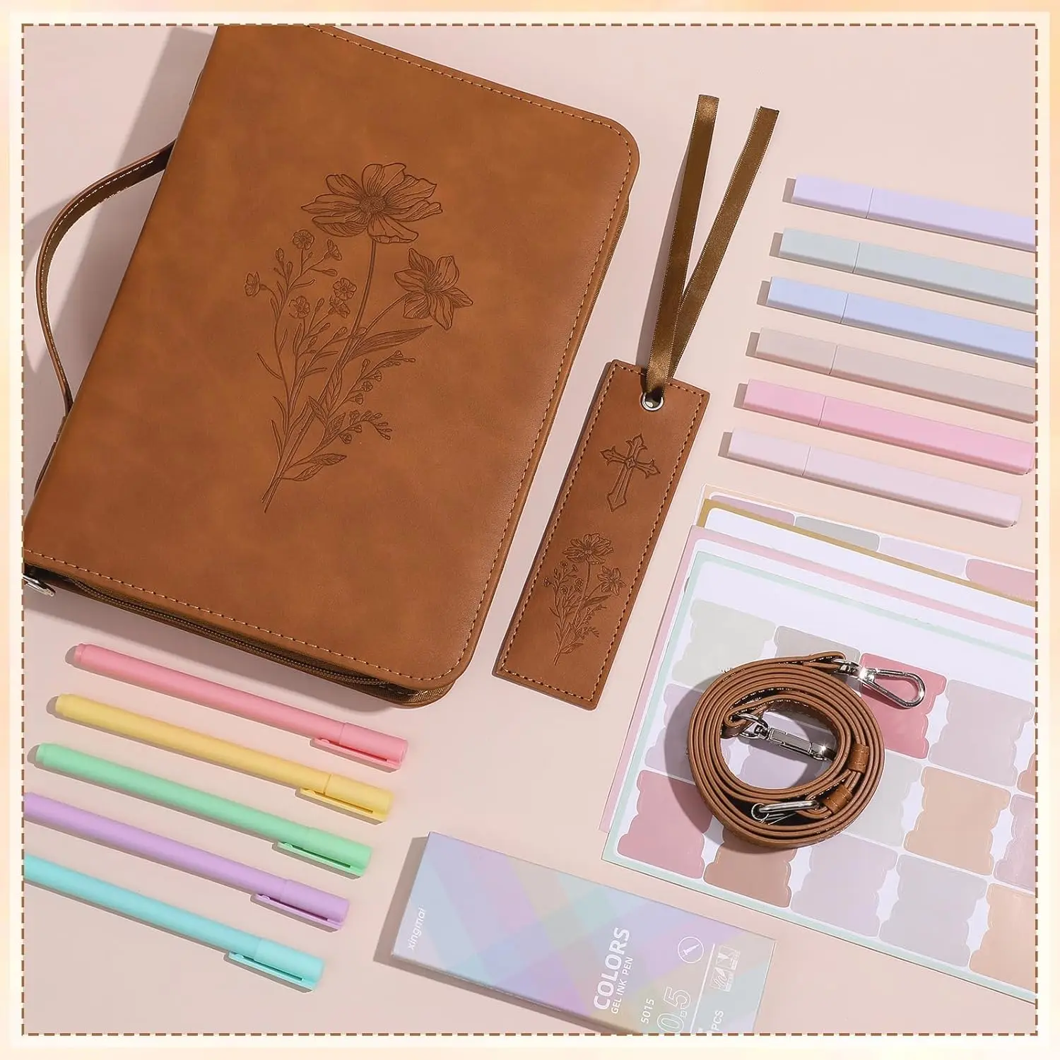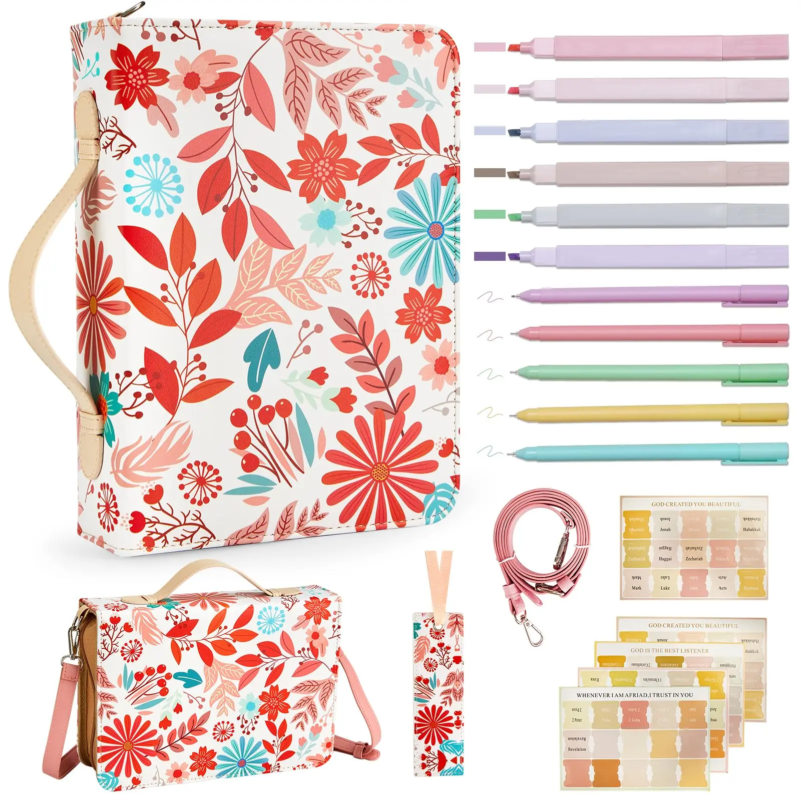 19PCS Floral Brown Leather Bible Cover Women Bible Cover Cases Teen Girls Christmas Gift Christian Carrying Bag Journaling Kit with Shoulder Strap Highlighter Pens & Book Marker Study Supplies