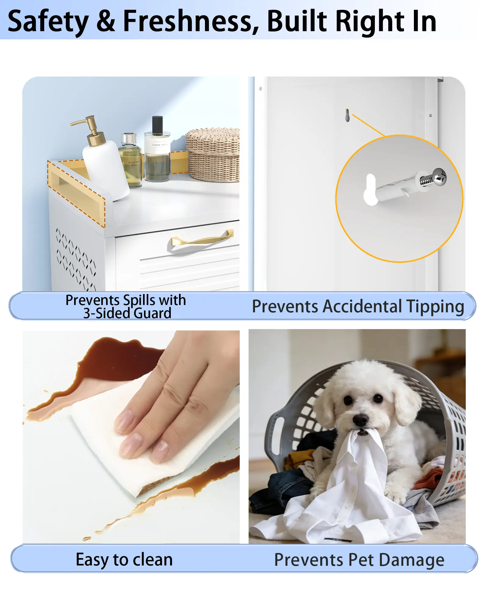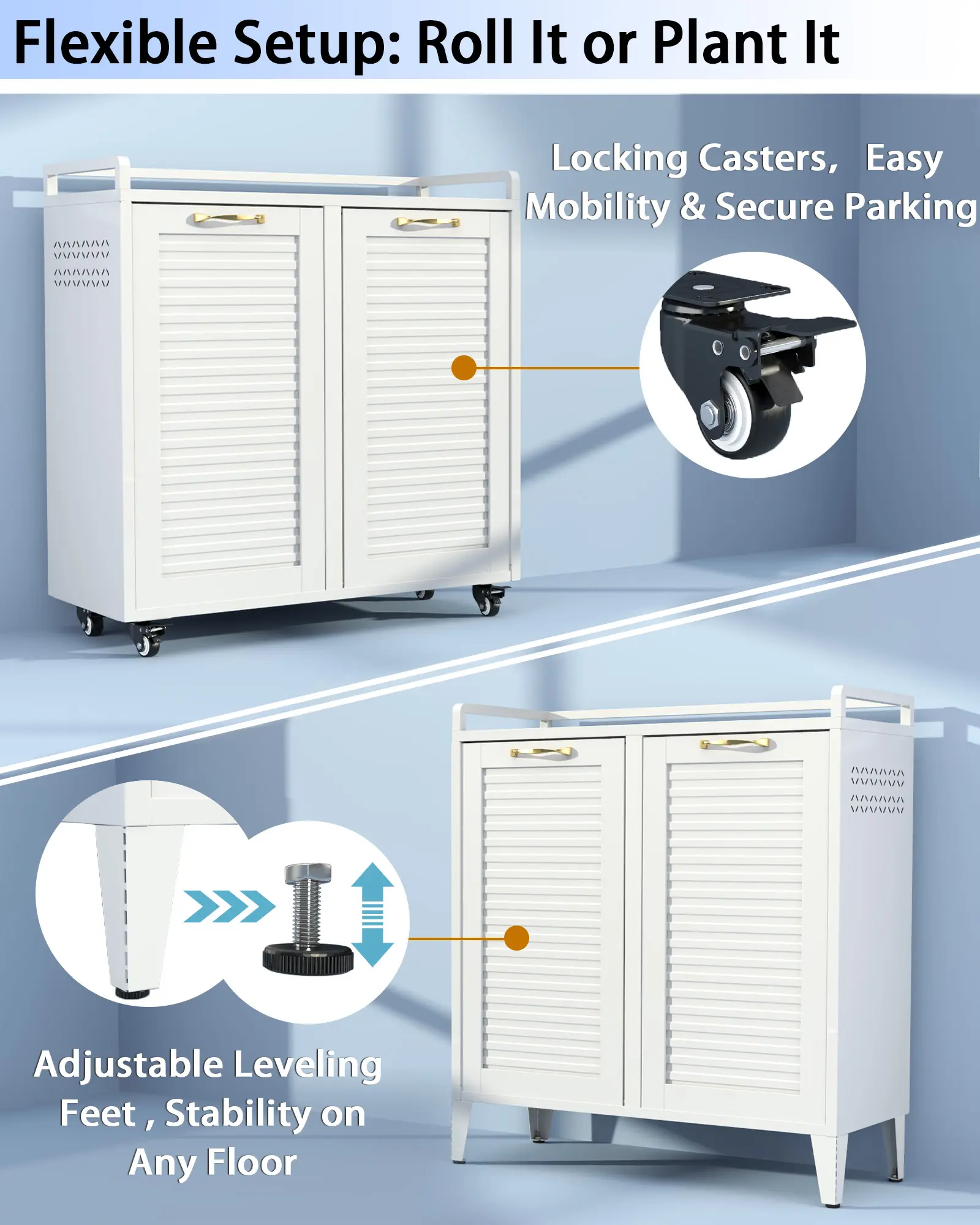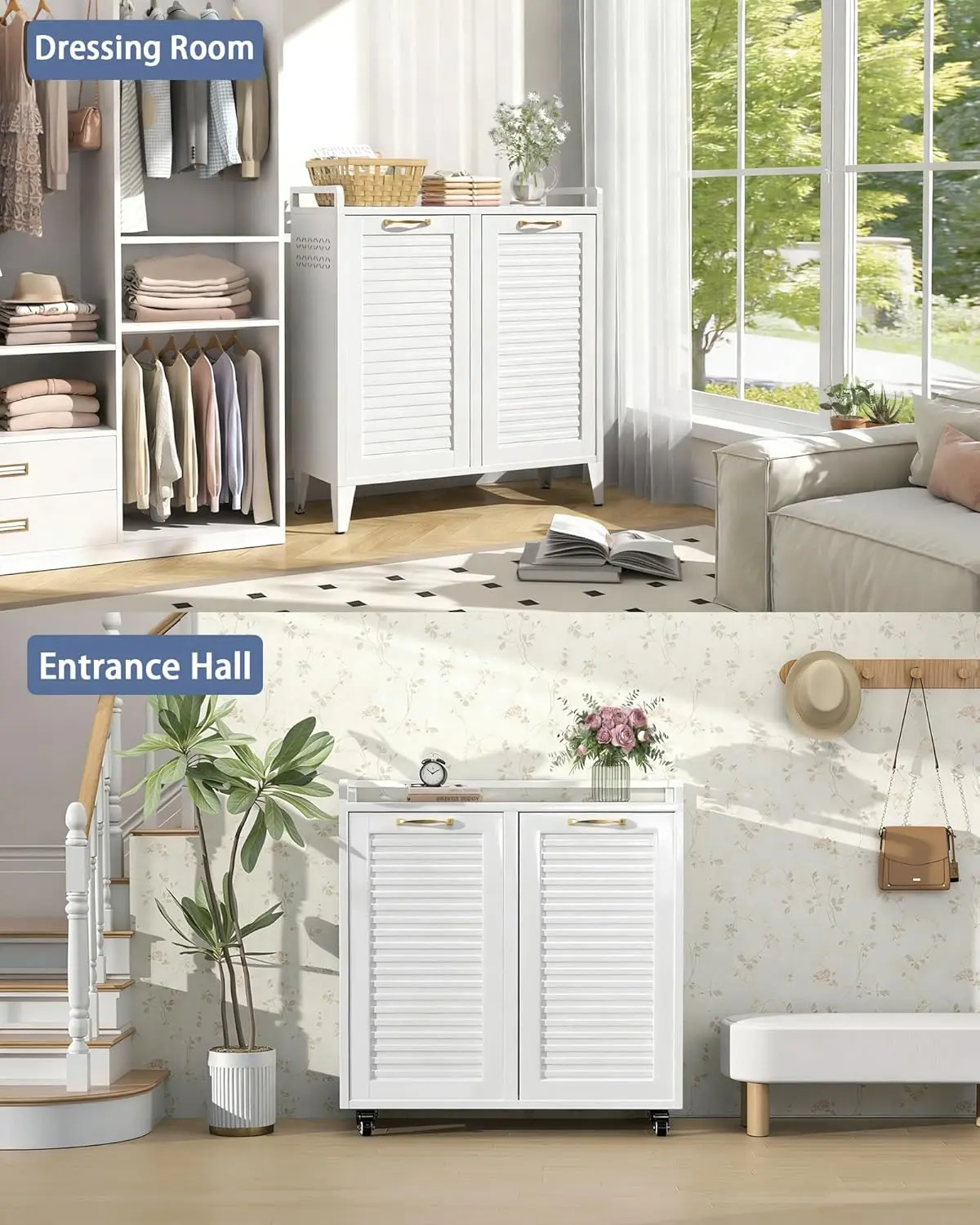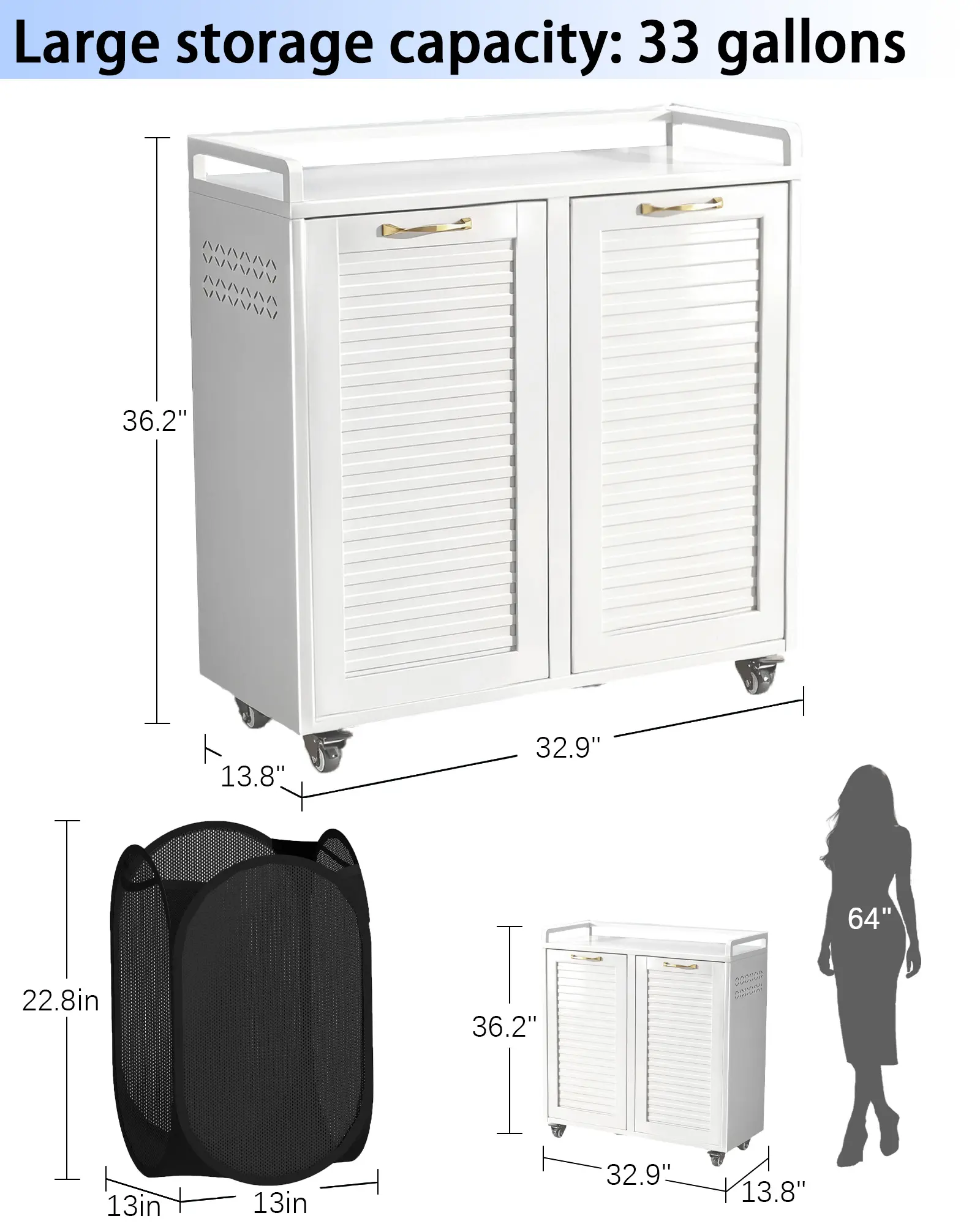 Double Tilt Out Laundry Hamper Cabinet, 2-in-1 Rolling Casters + Fixed Feet, Waterproof Rustproof Metal, 33Gal 2-Compartment for Bathroom, Laundry Room, Kitchen Optimized Product Description: This Double Tilt-Out Laundry Hamper Cabinet offers a practical storage solution to help organize your home and streamline daily routines. Built for Reliable Use The cabinet features a solid steel frame chosen for its strength. The finish helps resist moisture and is easy to clean with a damp cloth. It fits well in various household areas such as bathrooms, laundry spaces, or as a functional storage cabinet in the kitchen. Spacious and Functional Design With its two-room capacity, this cabinet accommodates laundry along with other household items. Two removable baskets include handles for easy transport to your washing area, aiding in sorting by color or fabric type. Designed for Convenience Flexible Placement: Locking wheels allow for easy movement and positioning. Added Stability: Includes hardware for secure wall attachment. Organized Top Shelf: Features a raised edge to help keep items in place. Versatile for Multiple Rooms The neutral white finish blends with existing decor. Use it as a laundry hamper in the bathroom, a storage unit in the kitchen or living room, or for general organization in bedrooms. Easy Setup with Support Designed for straightforward assembly with clear instructions included. Should you have any questions, our customer service team is ready to assist. Two Flexible Setup Options with Locking Casters & Adjustable Fixed Feet: This versatile tilt out laundry hamper and double laundry hamper solves the issue of single installation that can’t balance mobility and stability. Equipped with 4 locking casters, this laundry cabinet & hidden laundry hamper cabinet allows smooth rolling for room-to-room movement and can serve as a laundry cart. You can also attach fixed feet for stable placement. Ideal for families, apartment dwellers and renters, fitting bathroom, laundry room, kitchen and bedroom layout needs. Also works perfectly as a tilt out trash can cabinet for kitchen 33 Gallon Mega Capacity – 2 Separate Compartments: This tilt out laundry hamper & double laundry hamper boasts 33 Gallons (125L) large capacity with two separate sorting compartments, providing organized storage for dirty clothes, towels and bedding. It supports classified sorting by color, fabric or family member, effectively solves the problem of messy and disorganized clothes storage, enhances laundry room organization and keeps your bathroom and bedroom clutter-free, and works perfectly as a hidden laundry hamper cabinet & practical laundry cabinet for daily family use. 36.2" x 13.8" x 32.9" Durable Steel Construction – Built to Last: This tilt out laundry hamper solves rusting, warping and deformation in humid environments, as well as the tedious daily cleaning that wooden cabinets require. Built with waterproof & rust-proof cold-rolled steel, it maintains its shape for years, and the smooth surface wipes clean in seconds. Unlike wood that absorbs moisture and cracks, this steel hamper stays solid. The eco-friendly powder coating is odor-free, and its recyclable materials help reduce your carbon footprint. Ideal for families, perfect for damp bathrooms, busy kitchens, and any space that demands durability without the upkeep Minimalist Modern Design – Warm Yet Refined: Featuring clean geometric lines and a soft, neutral color palette, the cabinet exudes modern charm while softening the typical “cold” metal look. It blends seamlessly into any décor — from contemporary to cozy Assembles in Under 30 Minutes: Watch the installation video on the main page — most users finish in under 30 minutes. Includes clear manual. All parts protected with foam & wooden boards, no damage during shipping Family-Safe Design & Worry-Free Support: Raised top guard prevents items from sliding off. Wall anchors stop tipping. Solid door — safe around kids and pets. Every product undergoes strict quality inspection. If any issue occurs — missing parts, damage, or assembly questions — contact us via Amazon message. We'll respond within 24 hours