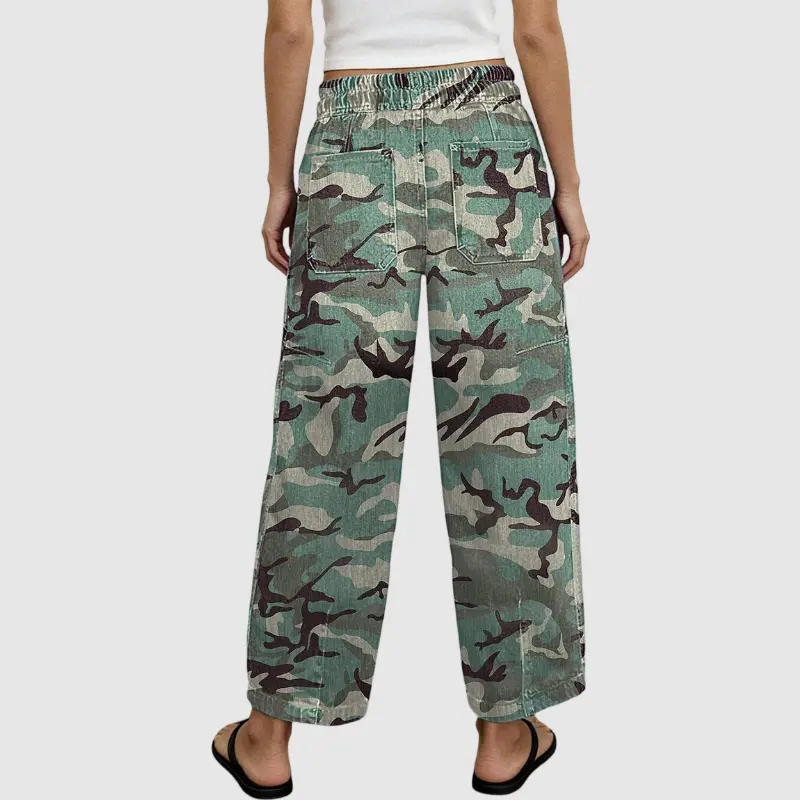 Discover the Flamingal Camo Drawstring High Waist Barrel Leg Pants. These pants feature a bold camo pattern, perfect for making a statement. The high waist design ensures a flattering fit, while the drawstring allows for a customizable snugness. Ideal for those who love a unique, eye-catching look.