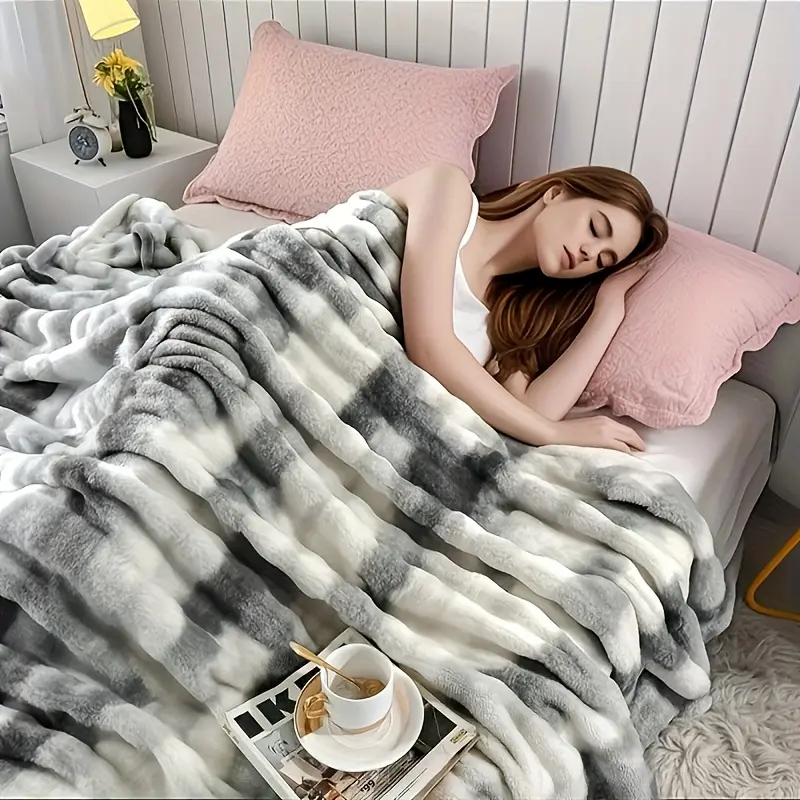 Extra-large blanket, measuring 108 inches by 90 inches, with a thickness that offers softness and comfort. This reversible blanket is made of faux rabbit fur material, crafted from warm fleece, and is perfect for naps and use in air-conditioned spaces.