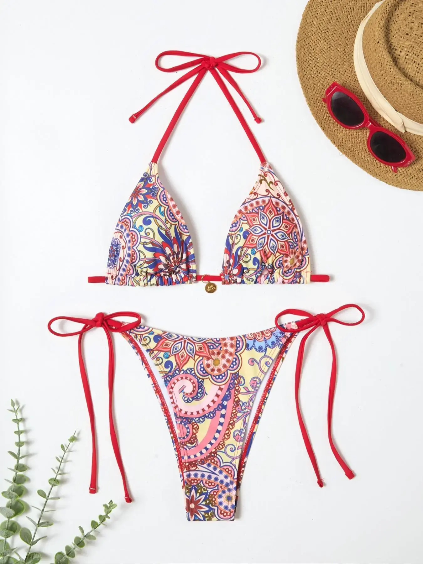 ·【Stylish Design】: This bikini set features a halter neck and backless triangle swim bra, paired with a tie-side swim thong, creating a trendy and chic look for the beach or vacation.