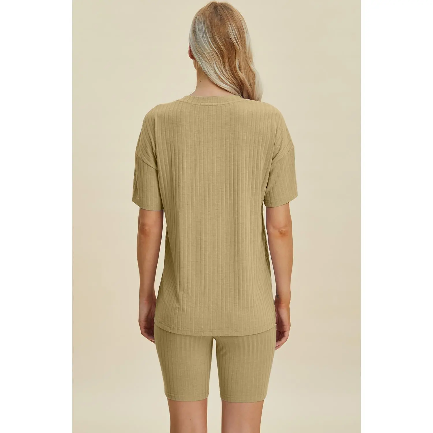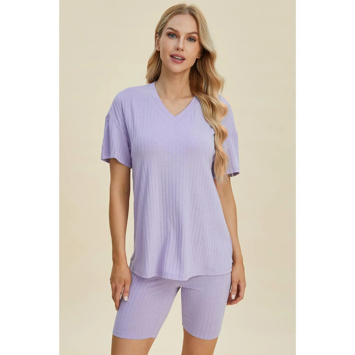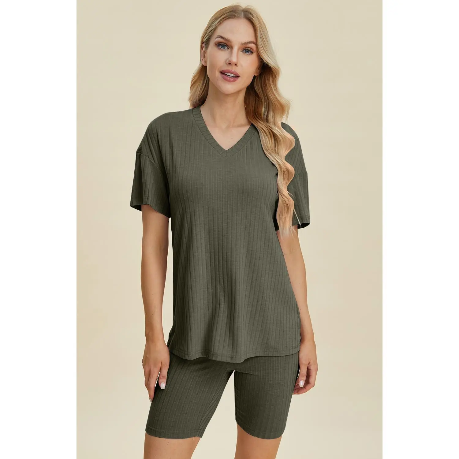 Basic Bae Ribbed Lounge Set - V-Neck Short Sleeve Top & Shorts - Effortless Everyday Comfort