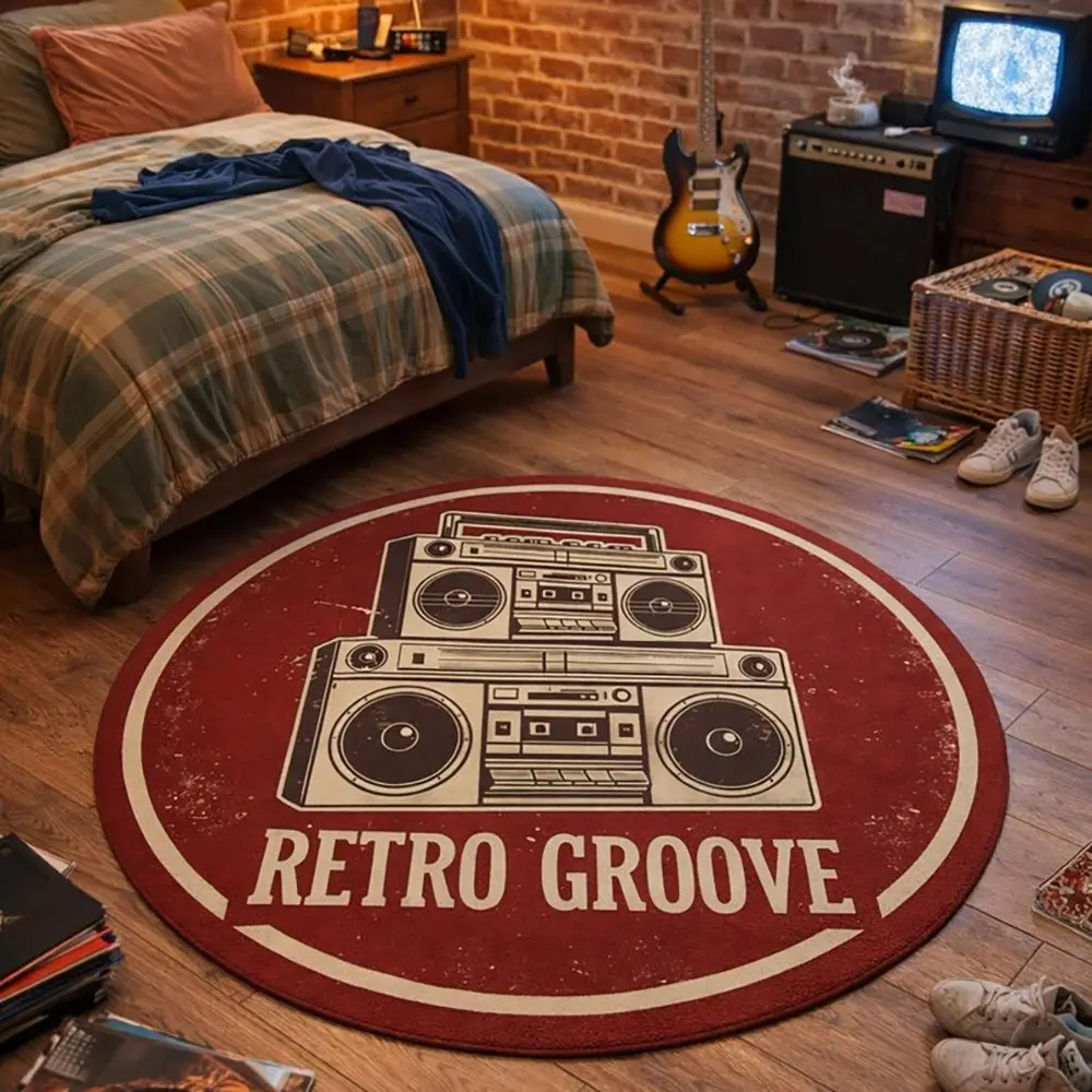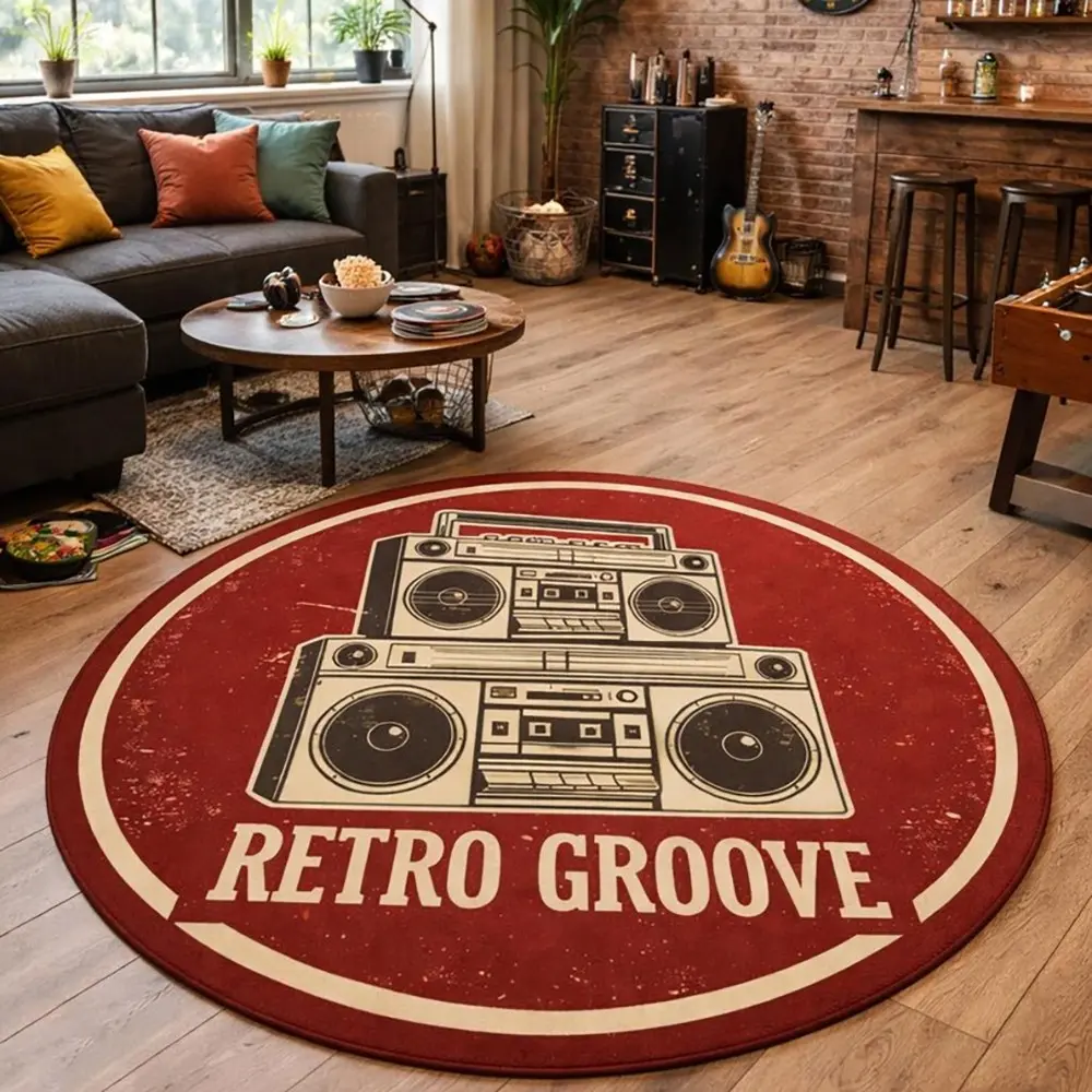 5. Retro Groove Round Rug, Vintage Style Living Room Sofa Runner, Bedroom Bedside Non-Slip Mat, Washable Decorative Carpet, Multi-Scene Use