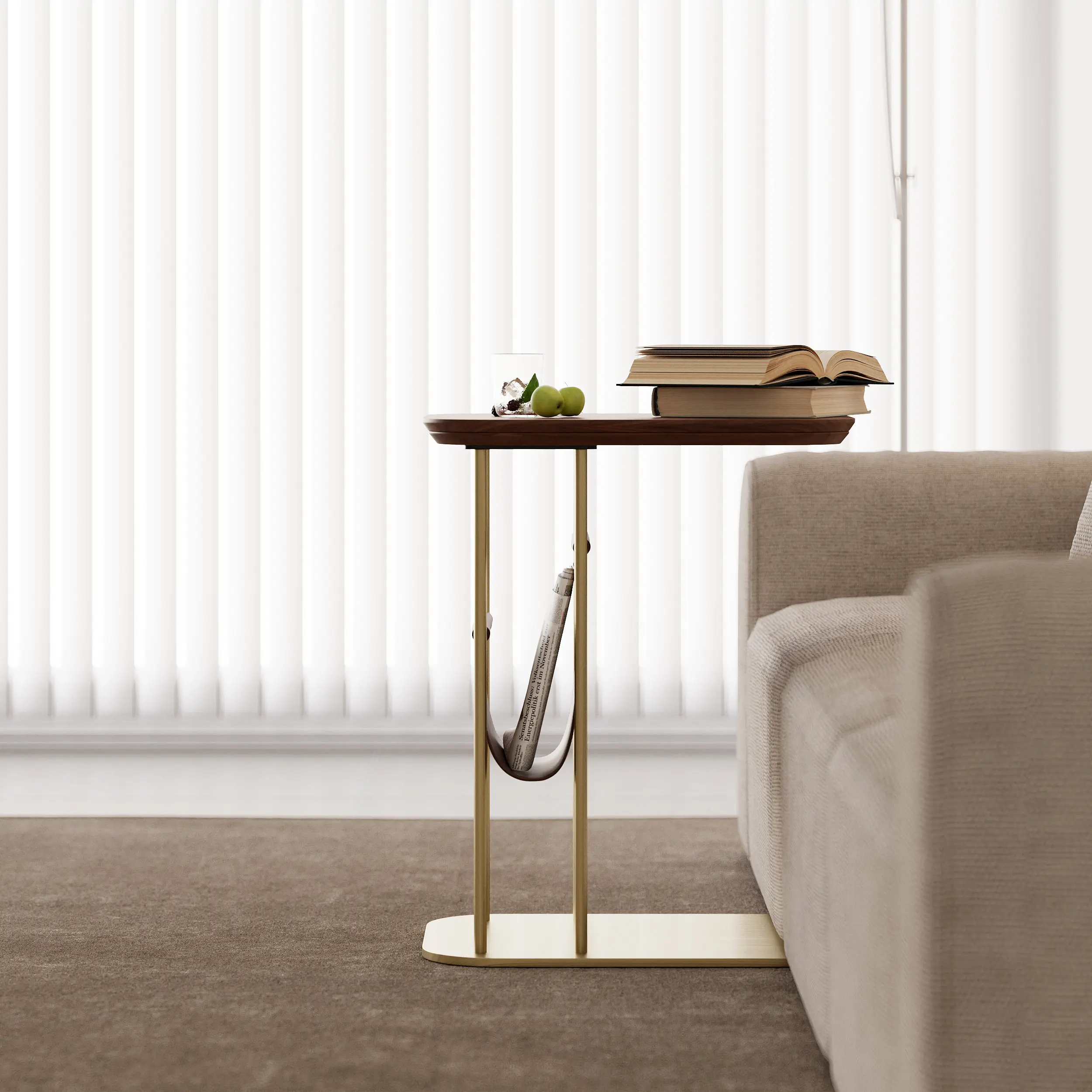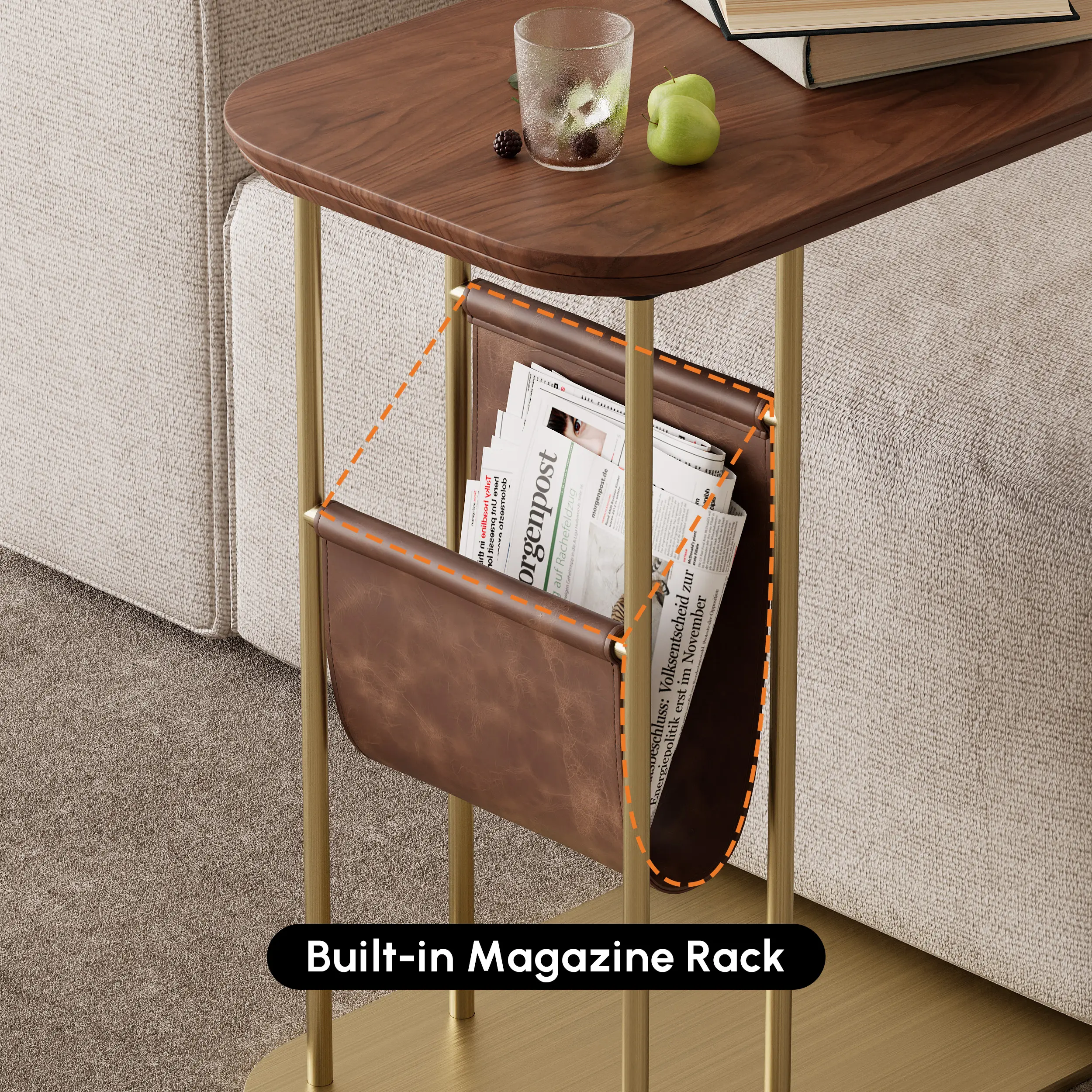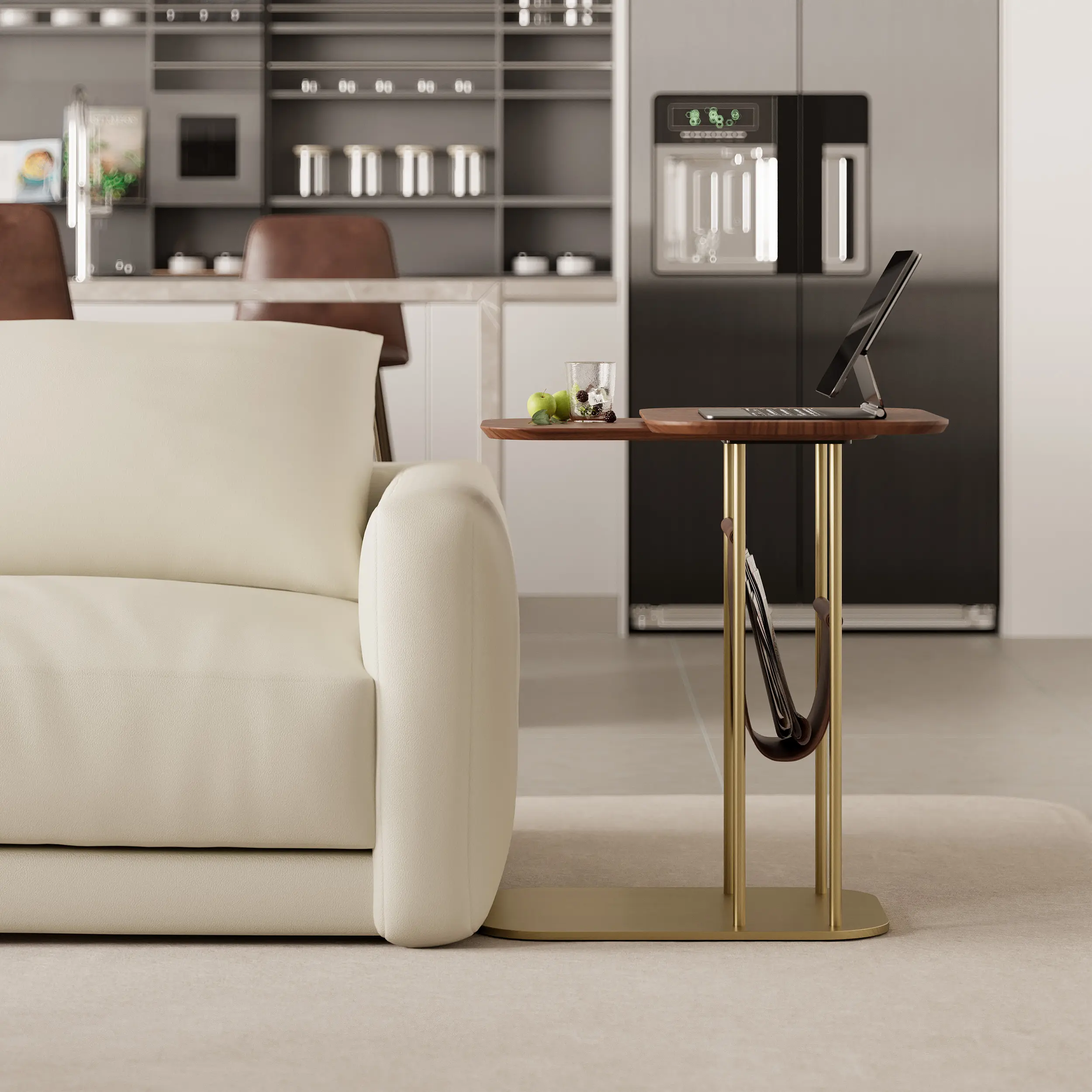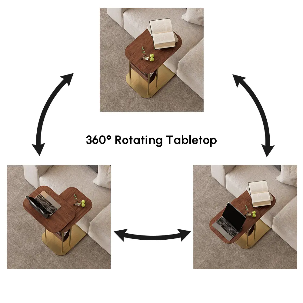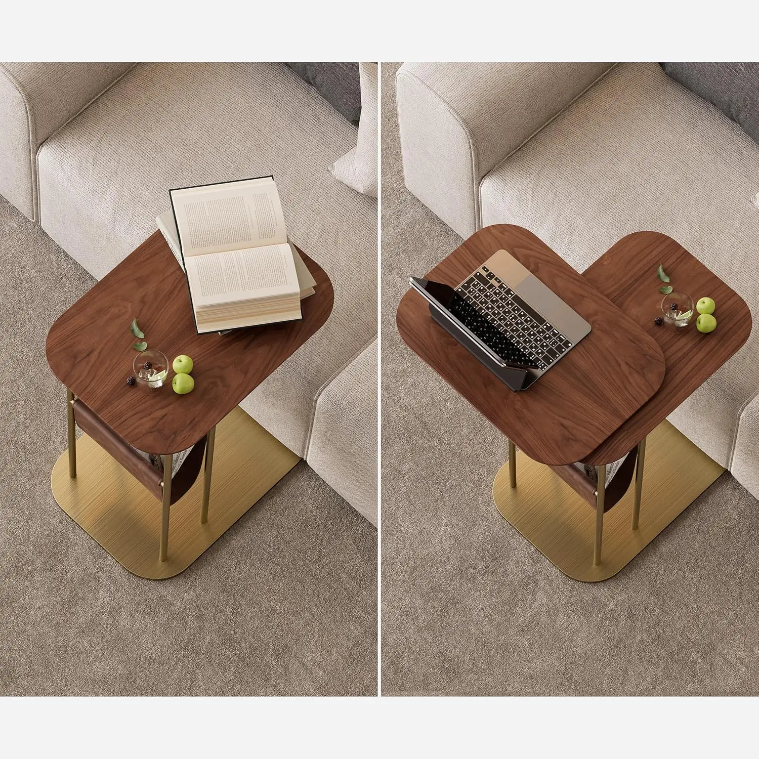 Defined by sleek geometry and warm elegance, this walnut and gold side table features a 360° rotating top and brushed titanium base. With a built-in magazine rack, it brings flexibility, storage, and refined style to modern living spaces.