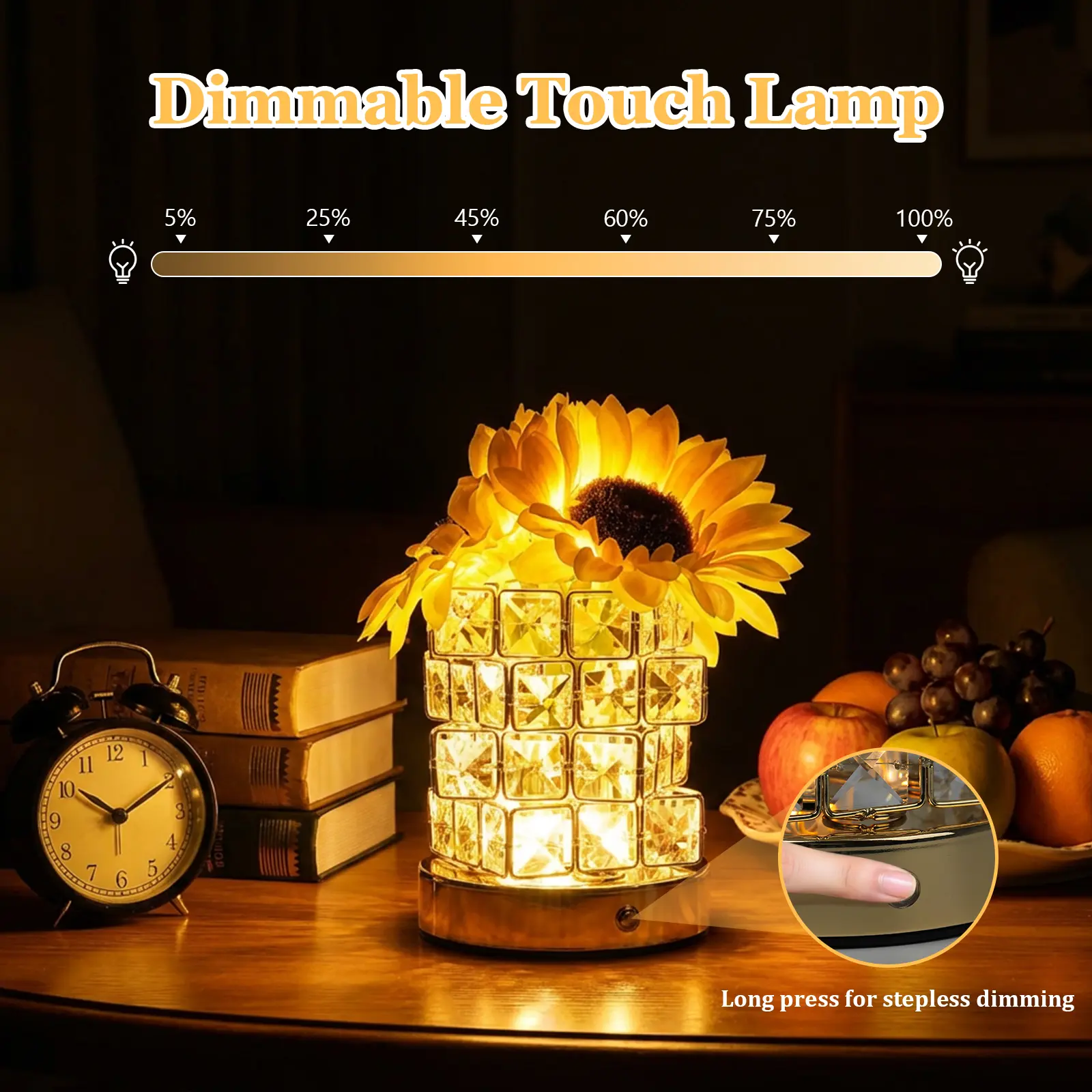 Crafted with meticulous attention to detail, the lamp features a lifelike, vibrant sunflower at the top, capturing the cheerful energy of summer blooms. The base is wrapped in premium, high-clarity square-cut crystals that refract warm LED light, creating a mesmerizing, sparkling effect that casts beautiful light patterns on your walls. The gold-toned metal frame and round base add a luxurious, modern touch, making this lamp a focal point in any room.