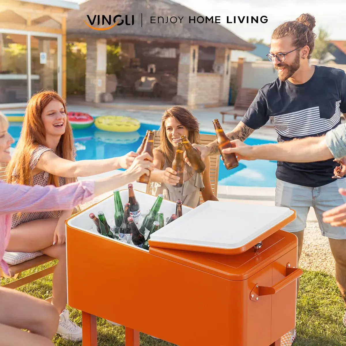 VINGLI 80 Quart Portable Outdoor Patio Rolling Cooler Cart Orange