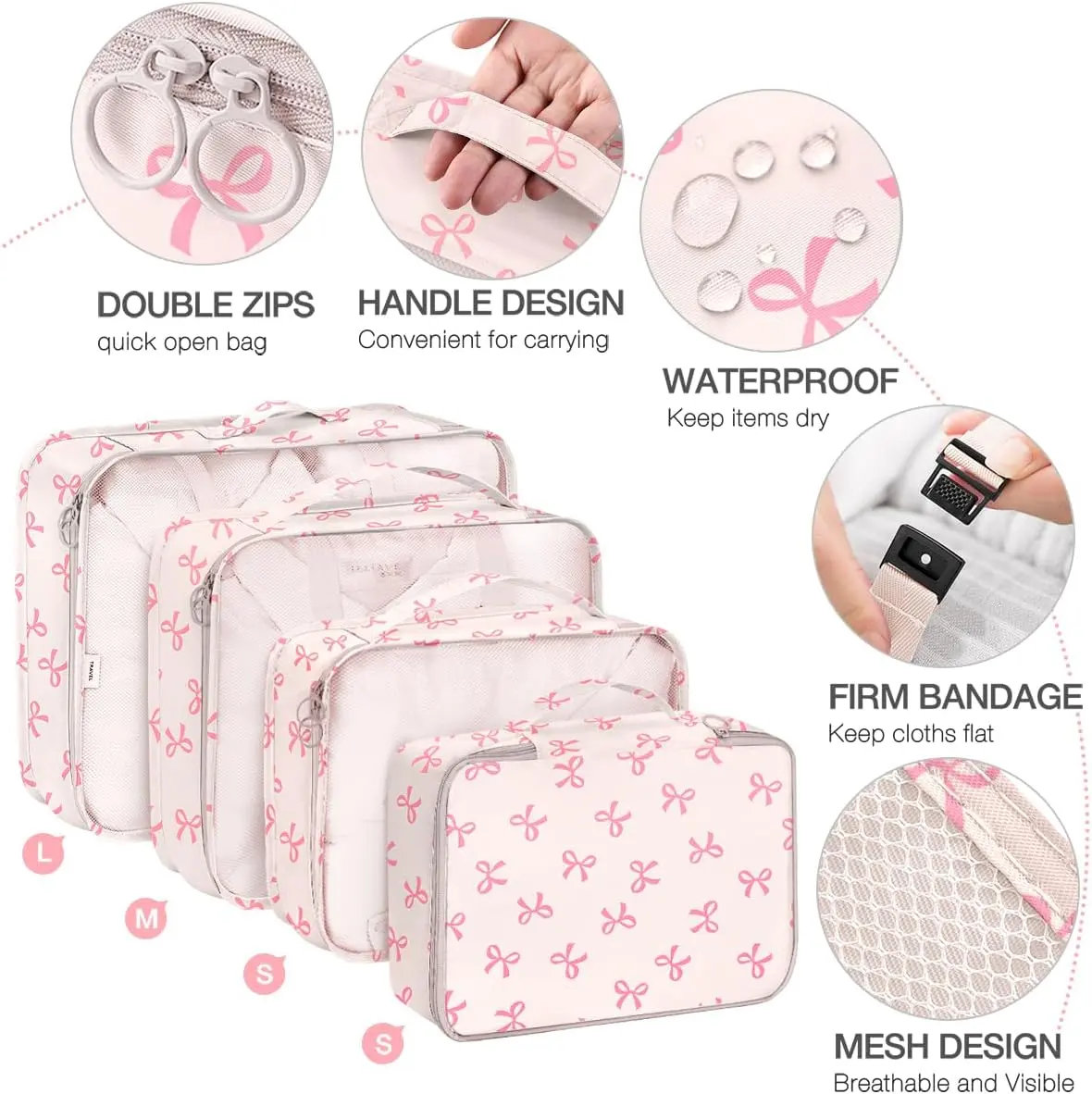 The set includes multiple compartments to separate different types of items, such as clothes, shoes, toiletries, electronics, and dirty laundry stored in the included drawstring bags. This organized layout helps save space and time during travel.