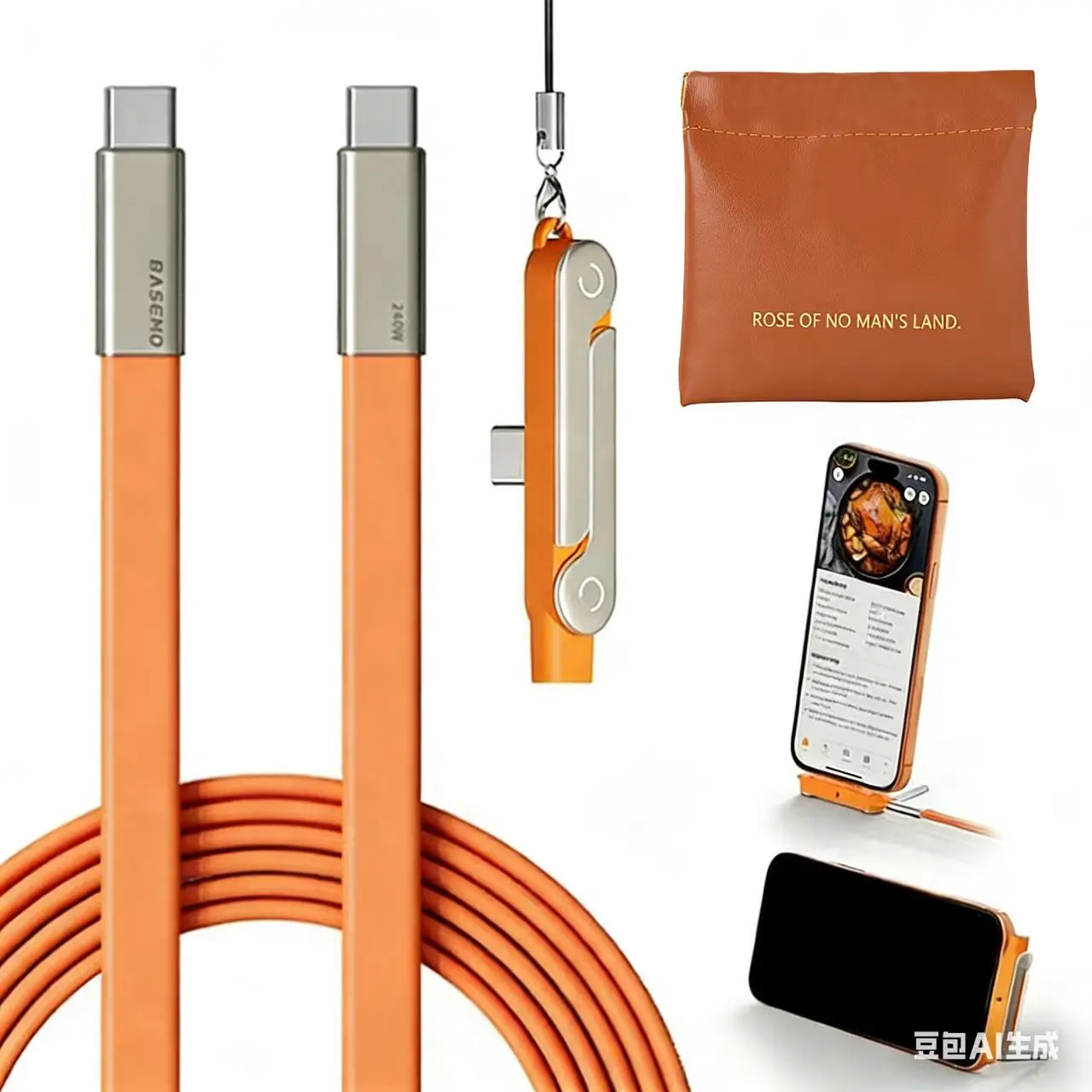 No more tangles! This cable is tangle-free, providing a smooth charging experience. It includes a storage bag for convenient storage. Single head, set. Free combination creating infinite possibilities. PD240W Type-C to Type-C cable. 240W Adapter Type-C to Type-C interface. Stand data cable supports while charging. Comes with a storage bag.