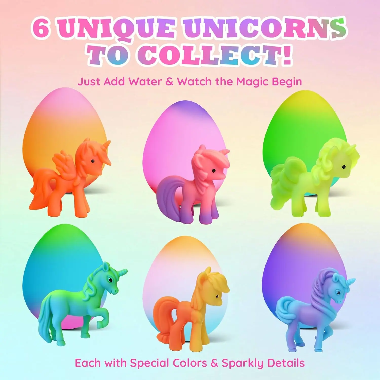 6 hatching and growing Unicorn eggs with 6 Unicorn, water-activated expansion toys, safe and fun magical transformation experience, perfect for Easter and birthday gifts.